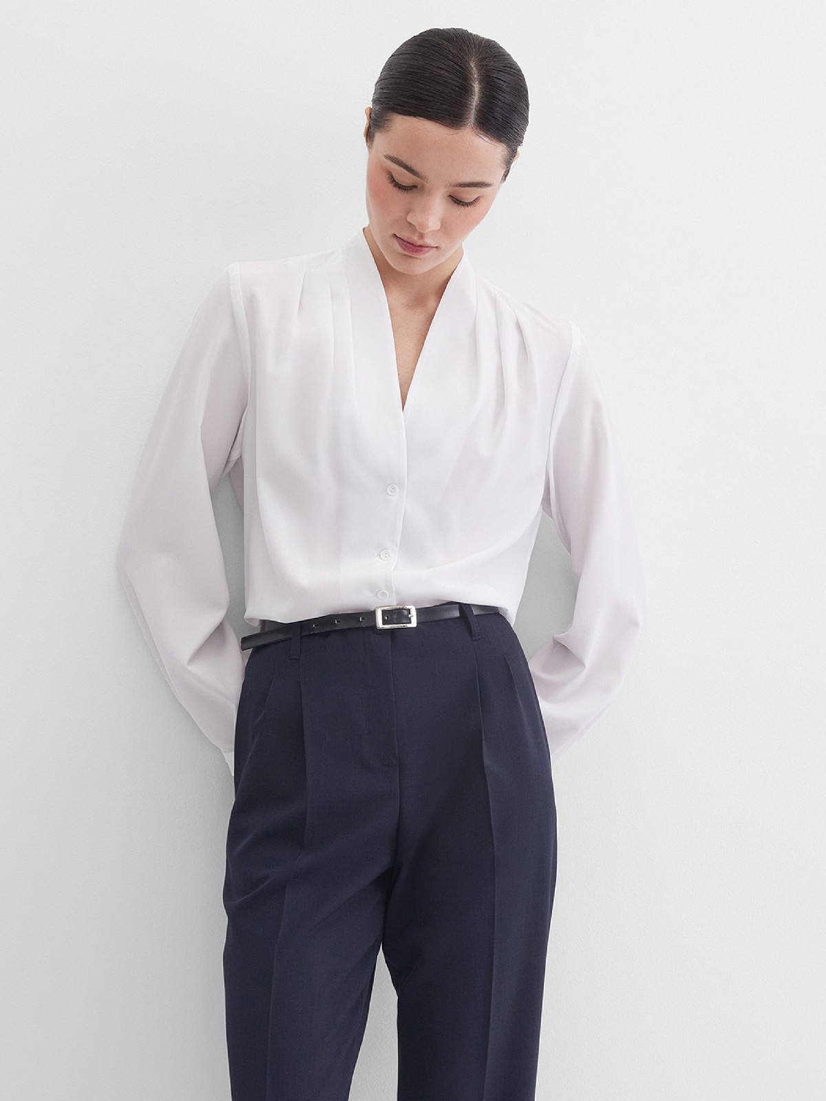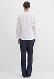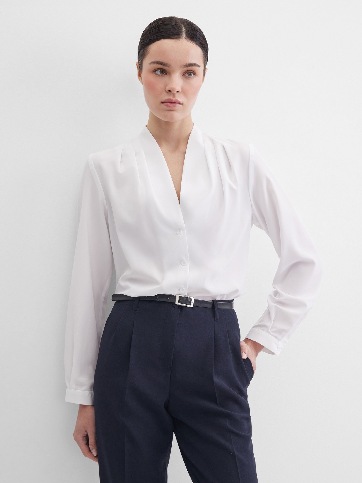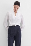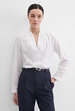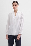 Легкая белоснежная блуза из мягкой поливискозной ткани средней длины, ткань приятная на ощупь и проста в уходе, приталенный силуэт, V-образная горловина с цельнокроенным воротником и застроченными складками от плеча, застежка на мелкие пуговицы в цвет ткани, длинный втачной рукав на манжете.