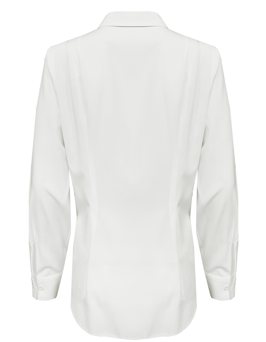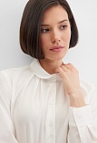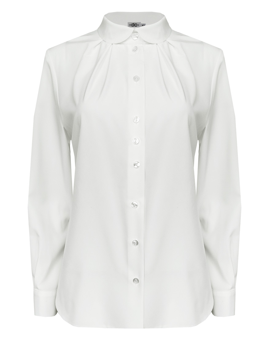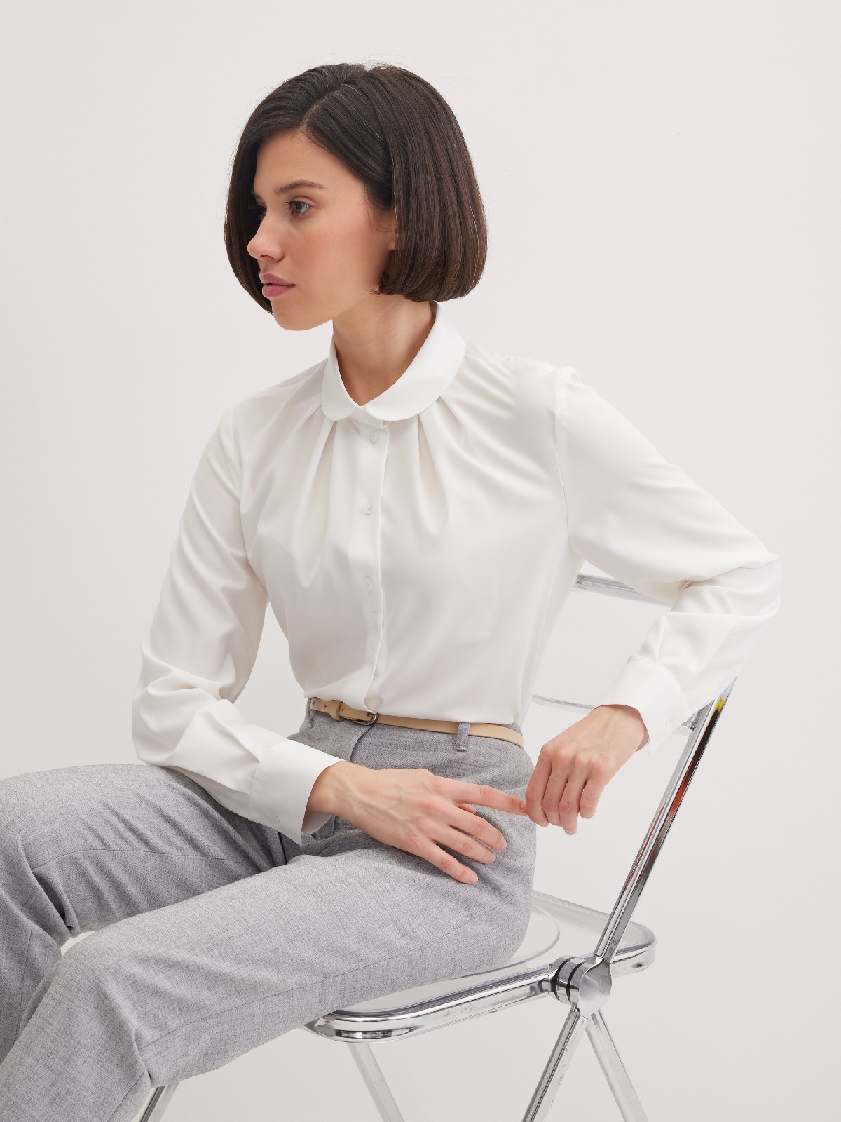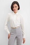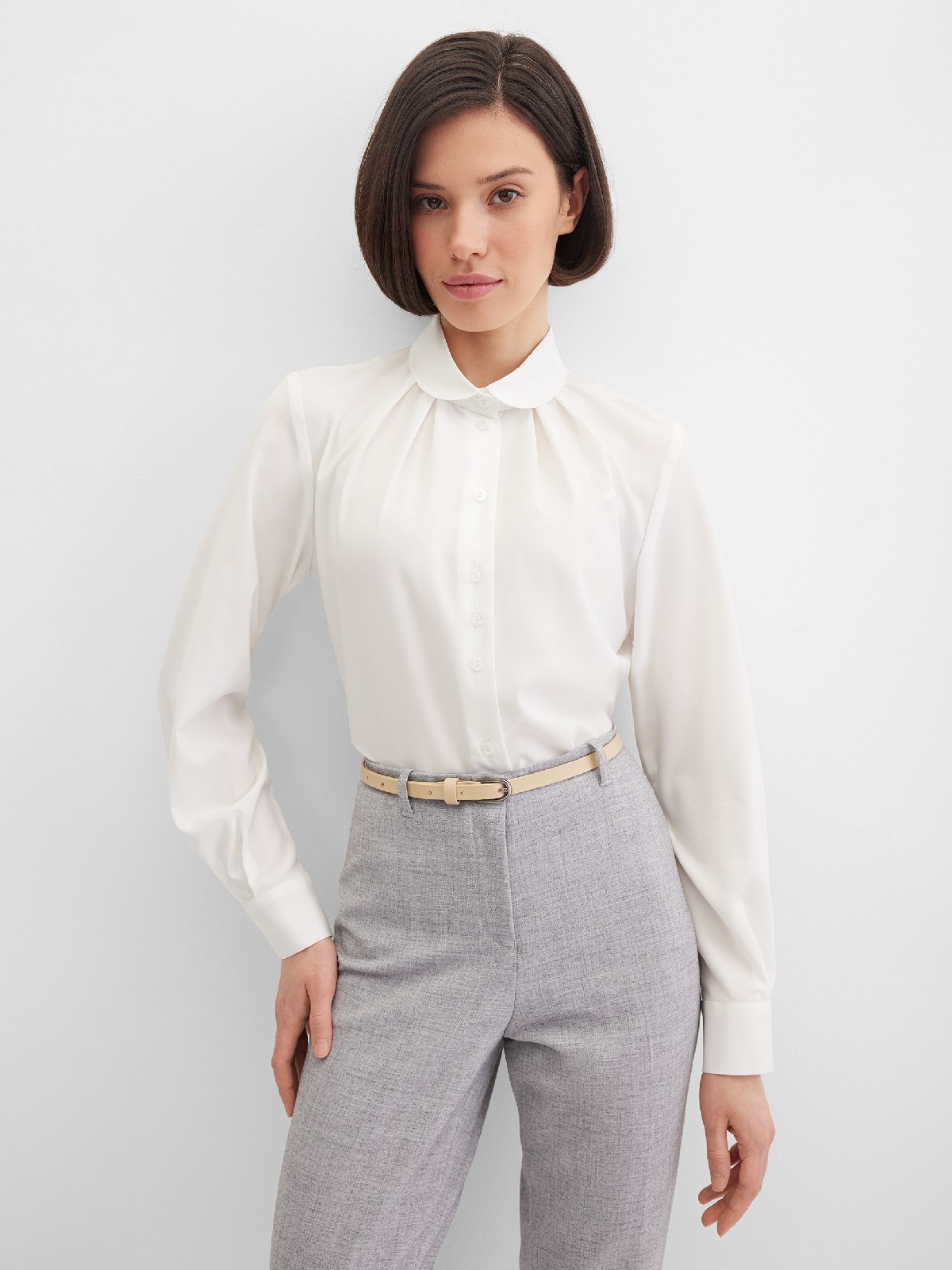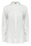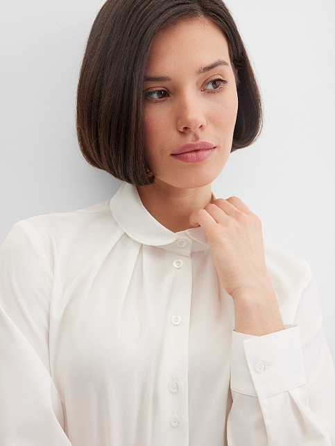 Струящаяся блузка из шелковистой вискозы  средней длины, слегка приталенная, по горловине заложены складки, рубашечный воротник на стойке, застежка на мелкие пуговицы, длинный рукав .