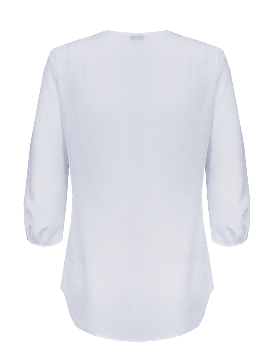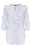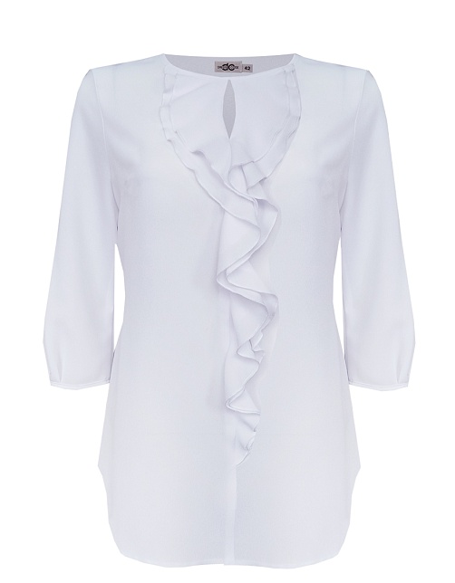 Белоснежная блуза из воздушной и полупрозрачной шифоновой ткани, средняя длина, приталенная, по переду вертикальный волан-рюша - небольшая оборка по вертикали  в сочетании с неглубоким вырезом визуально стройнит и вытягивает фигуру, круглая горловина и низ рукава обработаны тонким кантом в цвет основной ткани, втачной рукав длиной 3/4.