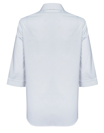 Белая блузка рубашка из качественной сорочечной ткани средней плотности с шелковой цветочной вышивкой на рукавах контрастного цвета, приталенный силуэт, горловина слегка расширена для комфортной носки, рубашечный воротник, застежка на пуговицы, модель удлиненная с фигурным низом, длина втачного рукава 3/4 , небольшая сборка по низу рукава на манжете с функциональной петлей и пуговицей.