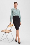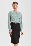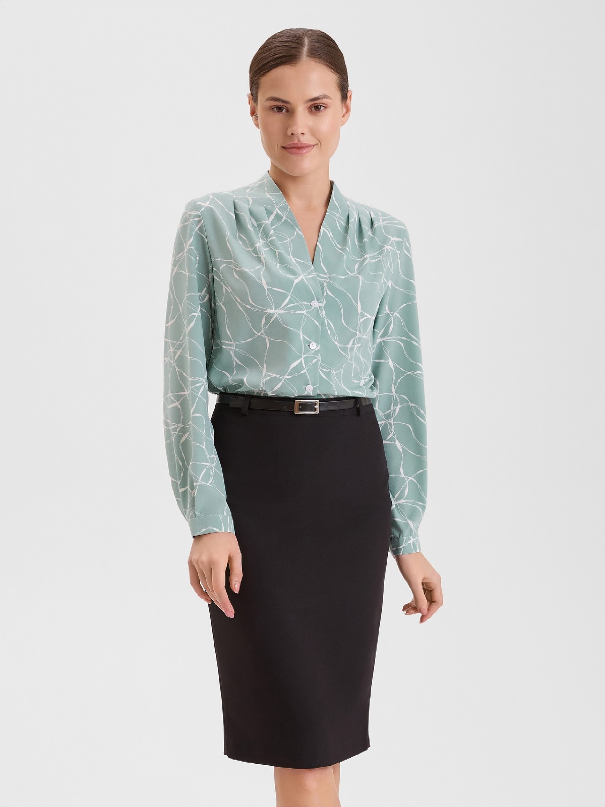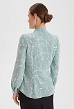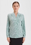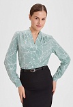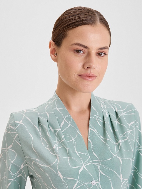 Блузка из струящейся поливискозной ткани в любимом оттенке зеленого в сочетании с белоснежным рисунком, средняя длина, приталенный силуэт, V-образная горловина с цельнокроеным воротником и застроченными мягкими складками от плеча, застежка на мелкие пуговицы, длинный втачной рукав на манжете.