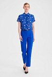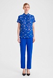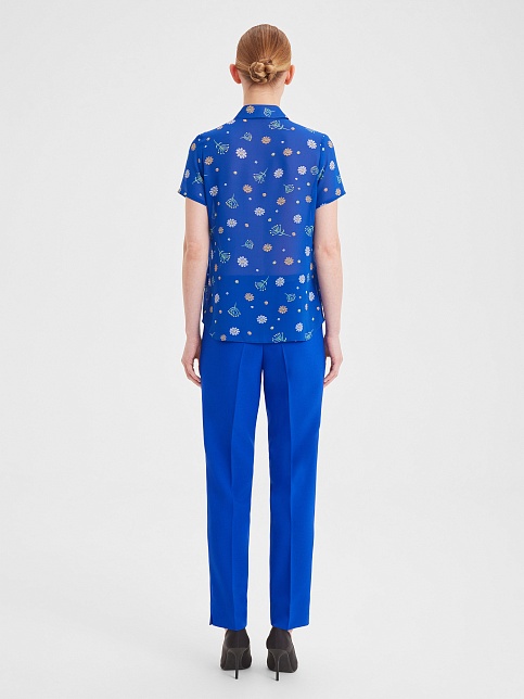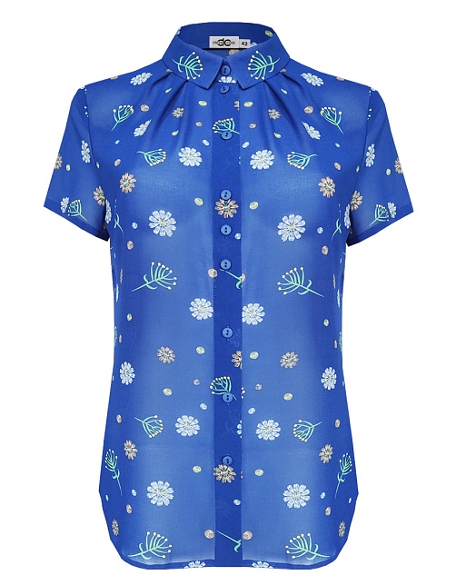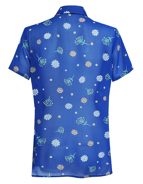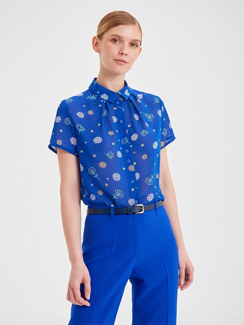 Ярко - синяя блуза из воздушной шифоновой ткани с нежным цветочным рисунком, средняя длина, приталенная, отложной рубашечный воротник, по горловине спереди заложены мягкие складки, застежка на  пуговицы, короткие рукава с узким манжетом по низу.