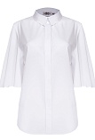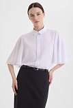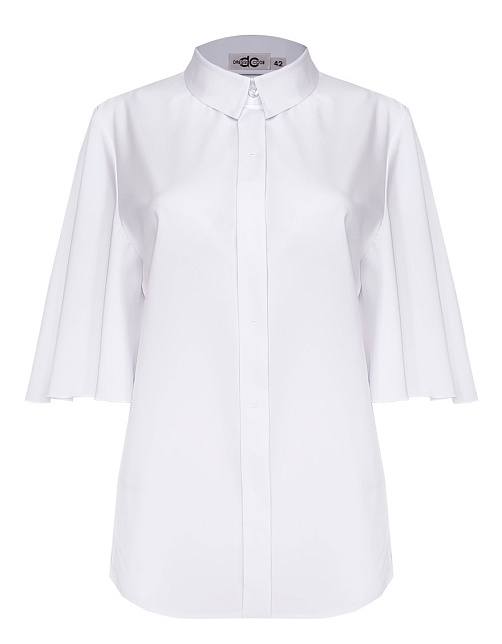 Блуза белого цвета из легкой и летящей поливискозы, средняя длина, свободный крой, рубашечный воротник, супатная застежка -  потайная застежка на пуговицы, которые спрятаны между слоями ткани и не видны, воздушный и подвижный рукав флаттер представляет собой объемный и широкий волан, который свободно ниспадает с плеча, образуя красивые и нежные воланы. Данный рукав добавляет немного объема плечам, однако прекрасно маскирует полноватые руки, чем помогает сбалансировать фигуру.