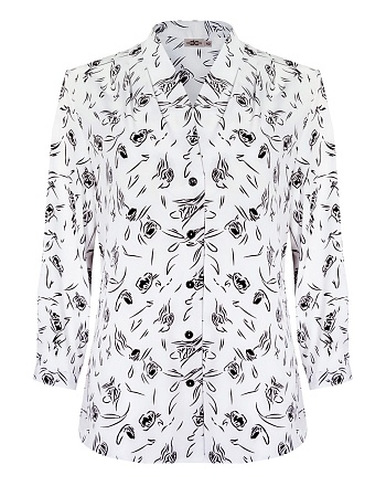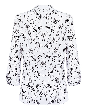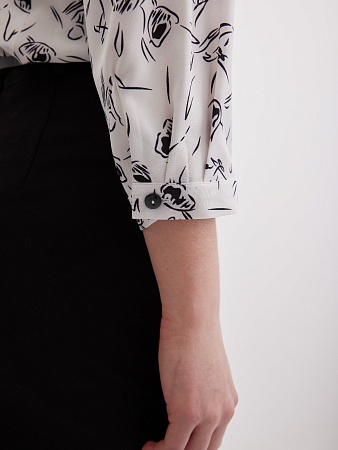 Оригинальная блуза из мягкой поливискозной ткани с монохромным рисунком в классической черно-белой расцветке, средняя длина, приталенная, по горловине заложены мягкие складки, отложной воротник с закругленными уголками на отрезной стойке, застежка на пуговицы, длина втачного рукава 3/4 на узком манжете.
