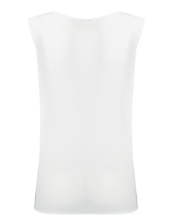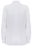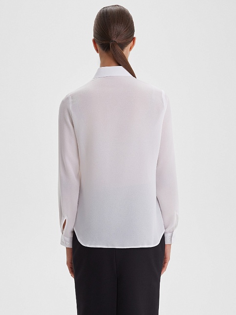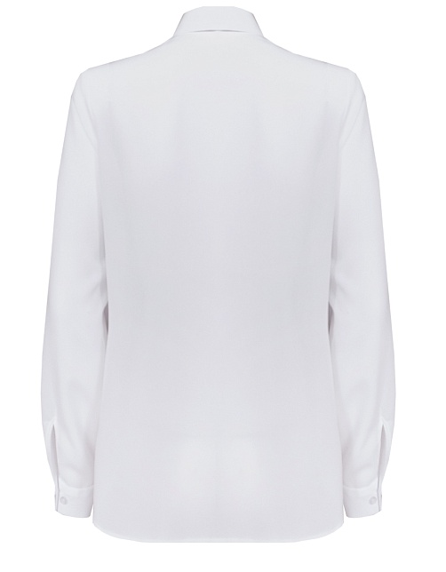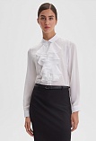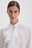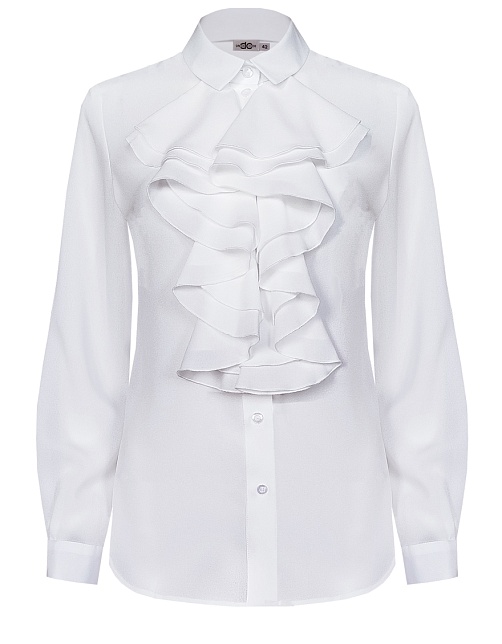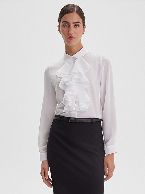 Изысканная блузка из полупрозрачной шифоновой ткани в ярком оттенке белого с ноткой кремового тепла, приталенная, средняя длина, отложной рубашечный воротник, от горловины к поясу спускается оборка, которая создает декоративный элемент и относится к разновидности воротника жабо, оно визуально удлиняет шею и делает образ более утонченным, застежка на мелкие пуговицы, длинный втачной рукав на манжете с функциональной петлей и пуговицей.