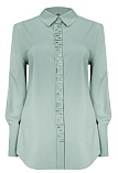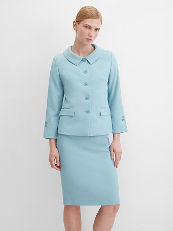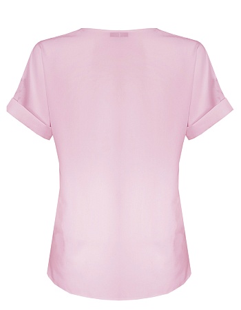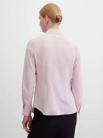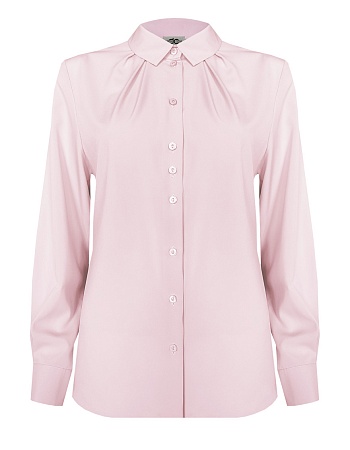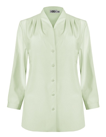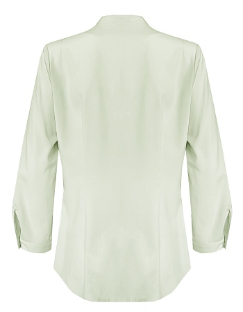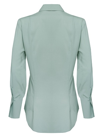Нежная блуза в приглушенном пастельно-зеленом цвете из струящейся поливискозной ткани украшена знаковым Меандровым узором, который воплотился в вышивке по планке, вид застежки  супатная -  внутренняя застежка на пуговицы, которые спрятаны между слоями ткани и не видны, приталенный силуэт за счет вытачек по спинке, рубашечный отложной воротник, модель удлиненная с фигурным низом, что позволяет носить ее навыпуск или под ремень, длинный втачной рукав с  высоким манжетом и застежкой на пуговицу.