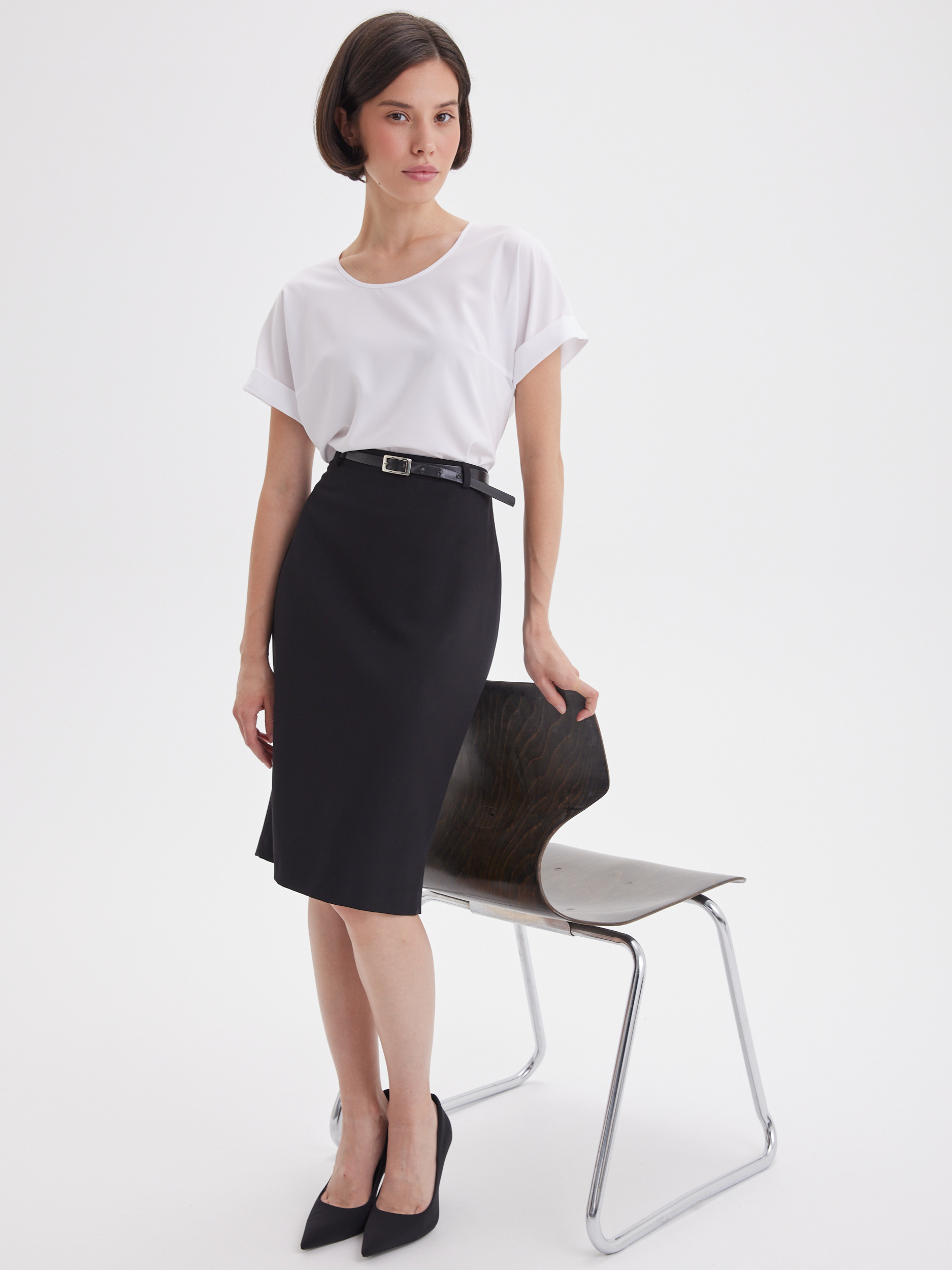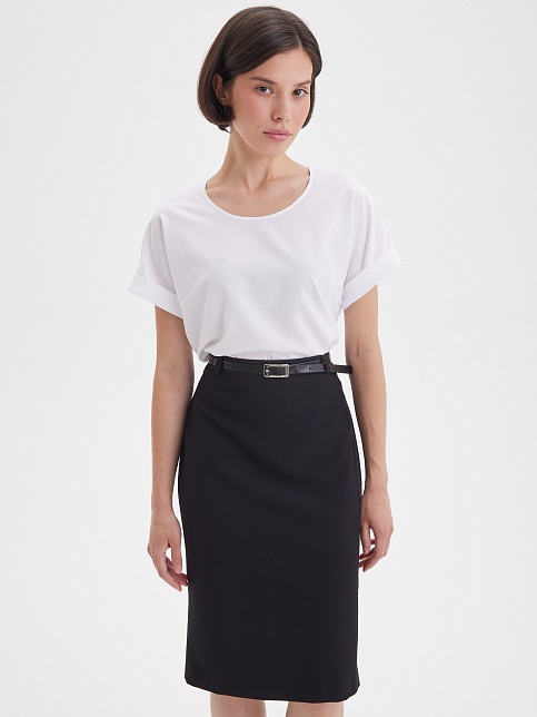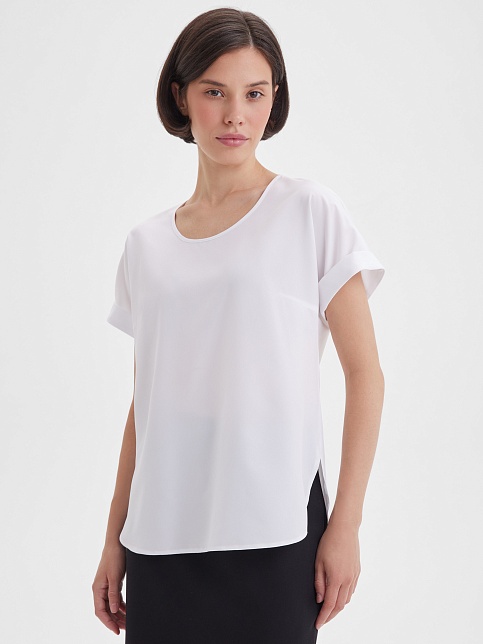 Легкая изящная блуза свободного кроя из тонкого и нежного материала с содержанием вискозы в классическом белом цвете. Элегантная модель средней длины, свободный крой дарит максимальную свободу движений и комфорт, цельнокроенный короткий рукав с отворотом, круглый вырез горловины обработан узким кантом и красиво смотрится при любой длине шеи, фигурный низ с аккуратными боковыми разрезами. Длина и умеренный объем позволяют носить ее навыпуск или заправленной.