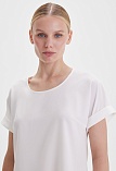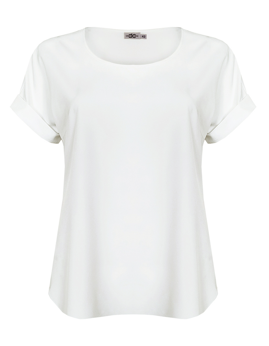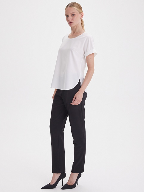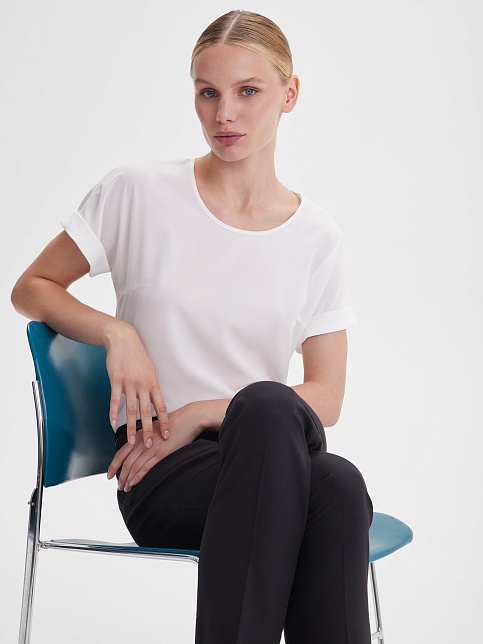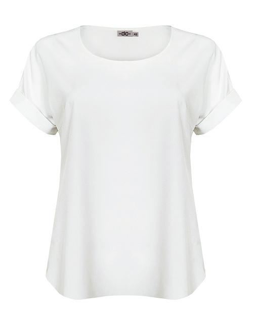 Легкая изящная блуза свободная блуза из тонкого и нежного материала с содержанием вискозы в универсальном молочном цвете. Элегантная модель средней длины, свободный крой дарит максимальную свободу движений и комфорт, цельнокроенный короткий рукав с отворотом, круглый вырез горловины обработан узким кантом и красиво смотрится при любой длине шеи, фигурный низ с аккуратными боковыми разрезами. Длина и умеренный объем позволяют носить ее навыпуск или заправленной.