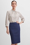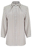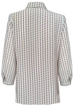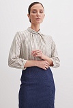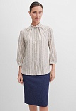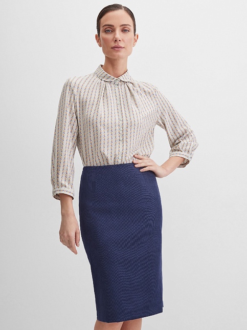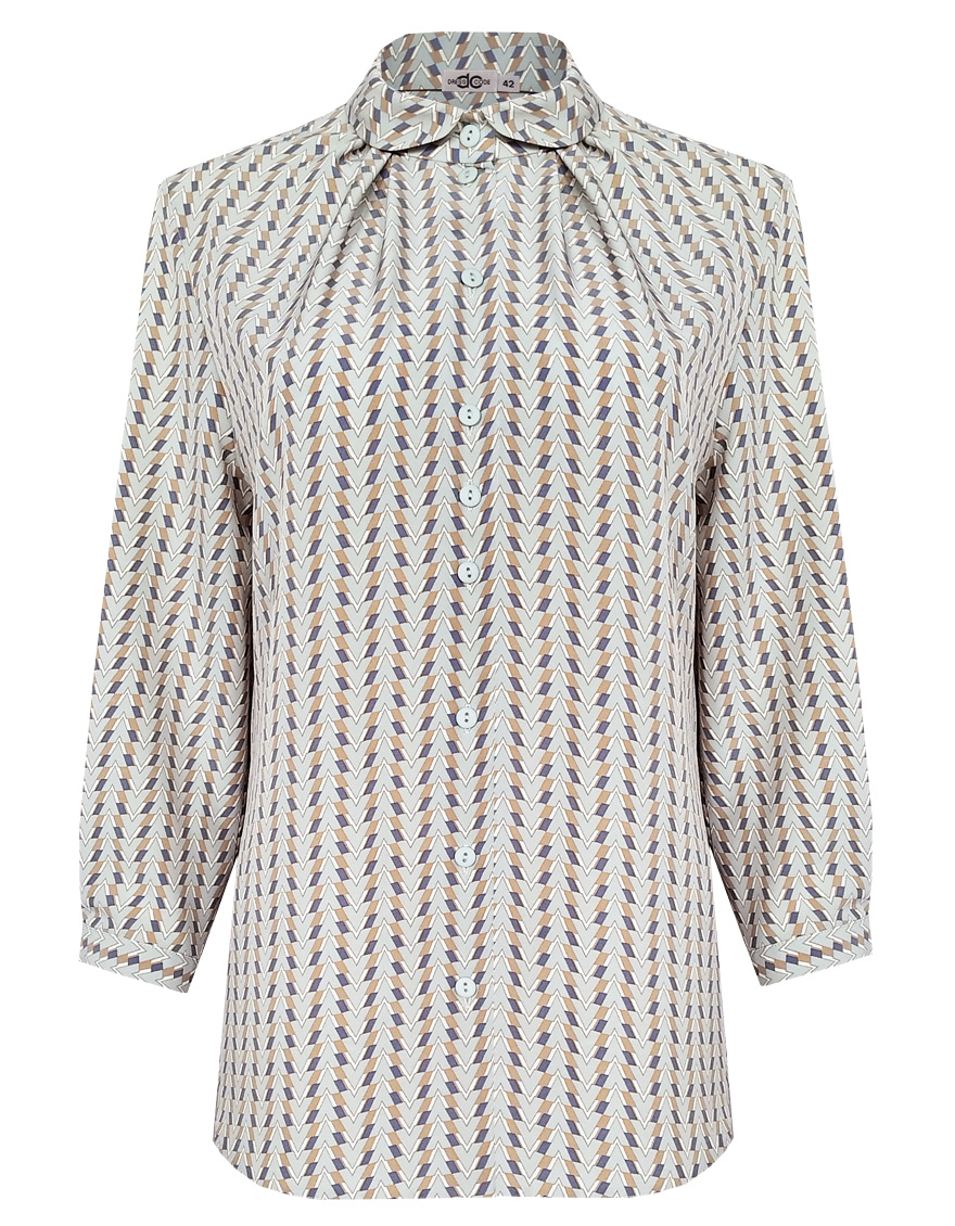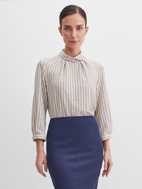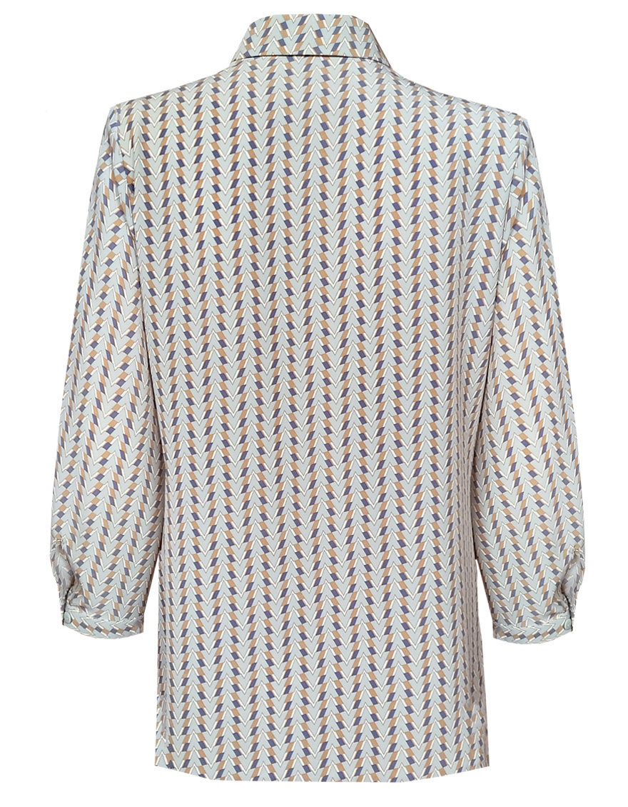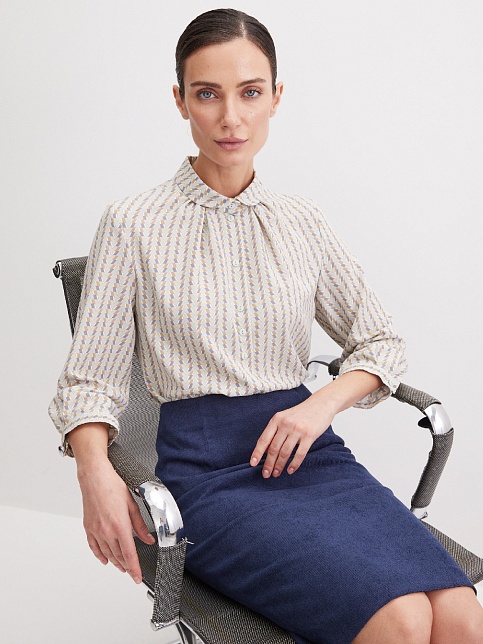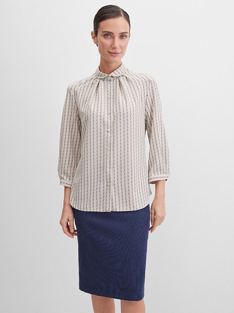 Элегантная женственная блуза из струящейся поливискозной ткани с разноцветным абстрактно-геометрическим рисунком в приглушенной цветовой гамме - набор мягких неярких оттенков, средняя длина, приталенная, по горловине спереди заложены мягкие складки, придающие образу романтичность, отложной воротник круглой формы на отрезной стойке, застежка на пуговицы, длина втачного рукава 3/4 на узком манжете с функциональной петлей и пуговицей.