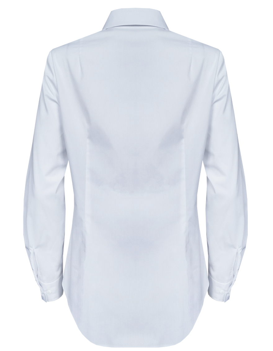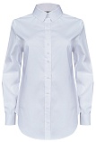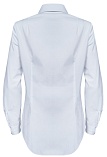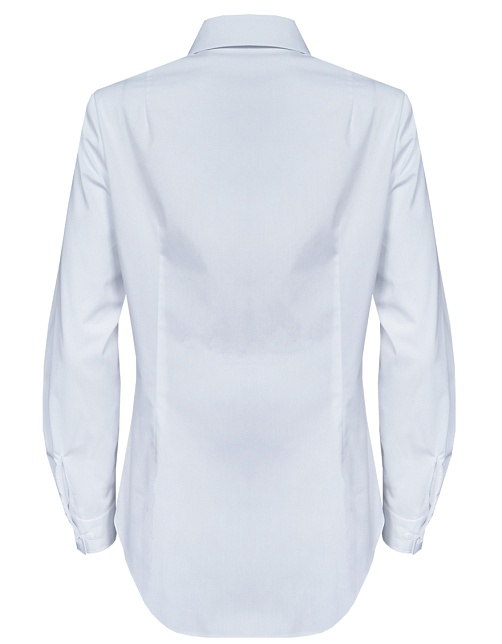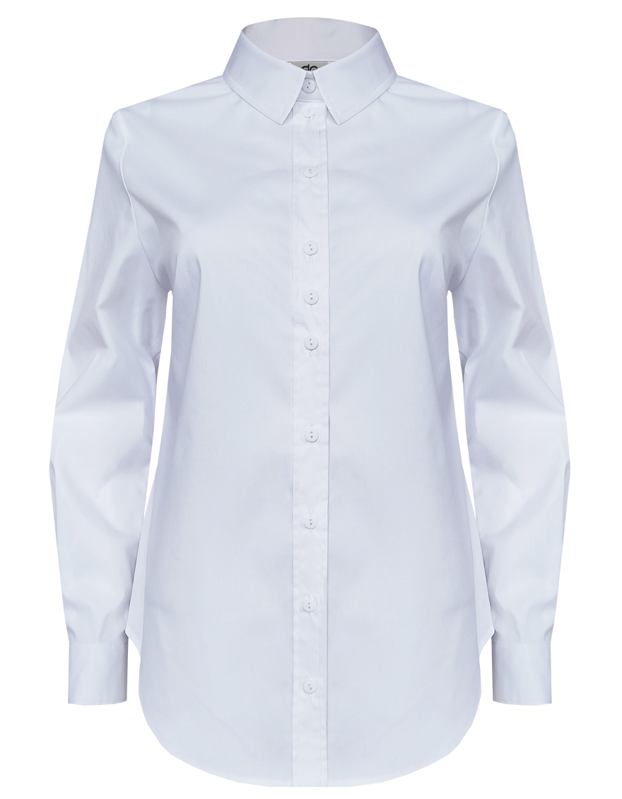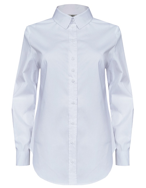 Блузка рубашка из белой сорочечной ткани высокого качества скроена по типу классической мужской рубашки без лишних деталей, легкая приталенность за счет талиевых вытачек по спинке, отложной рубашечный воротник на стойке, застежка на пуговицы, планка с воротником и манжеты декоративно отстрочены в цвет основной ткани, модель удлиненная с фигурным низом, длинный втачной рукав на манжете с функциональной петлей и пуговицей.