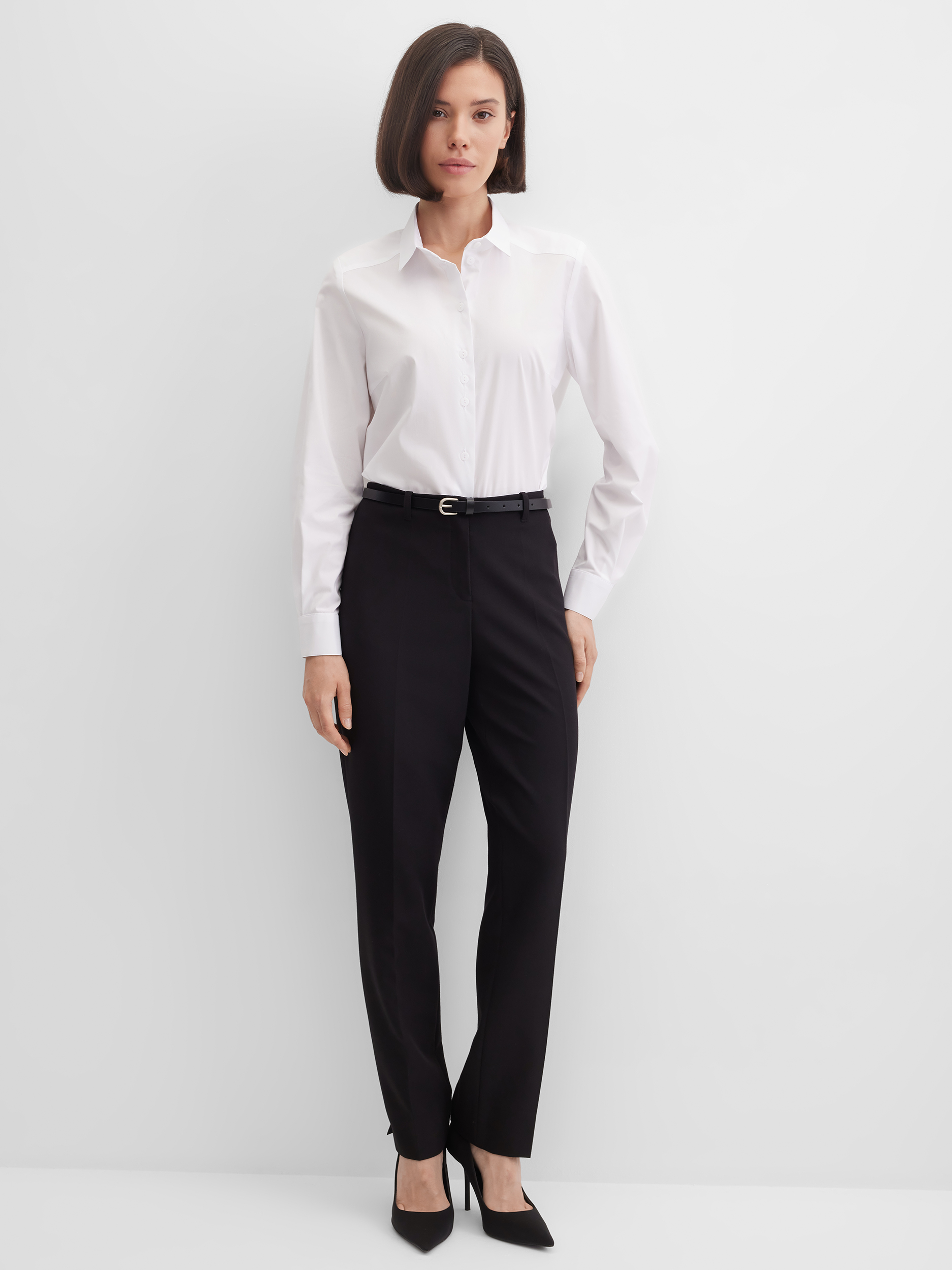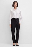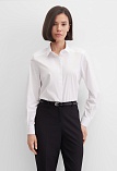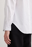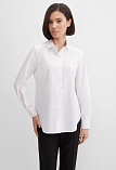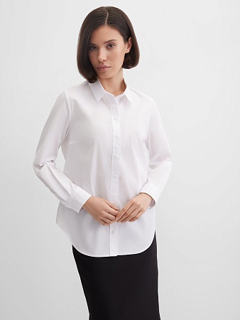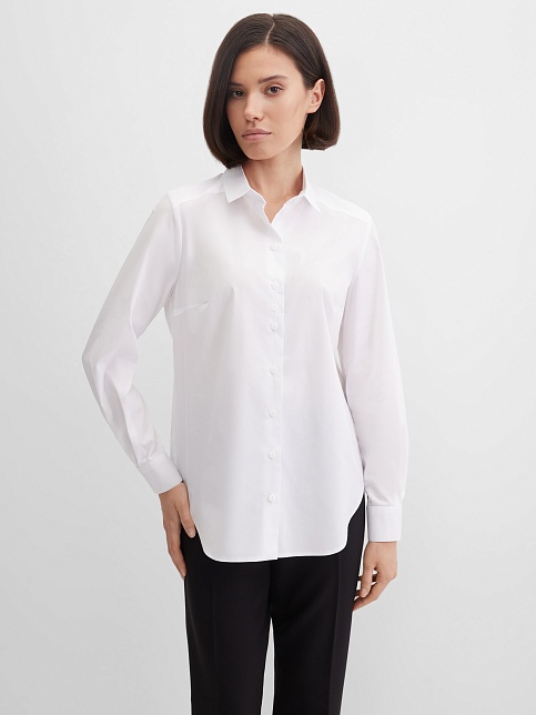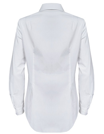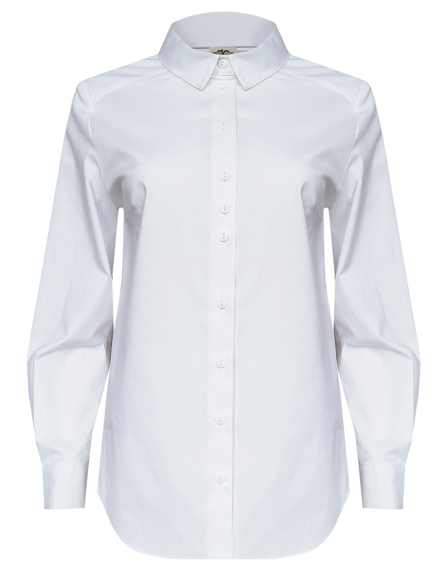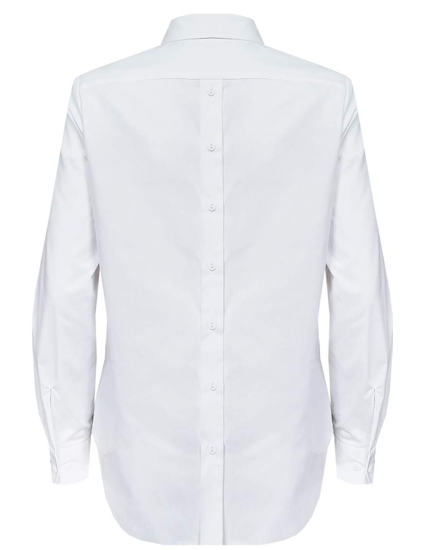 Блузка рубашка из белой сорочечной ткани высокого качества свободного силуэта, цельнокроеная кокетка исключает плечевой шов и позволяет добиться хорошей посадки в области плеч, отложной воротник на стойке, декоративный элемент по спинке в виде функциональной застежки на мелкие пуговицы украшает модель и формирует более свободной силуэт, по переду функциональная застежка на пуговицы, модель удлиненная с фигурным низом, длинный втачной рукав на манжете с функциональной петлей и пуговицей.