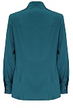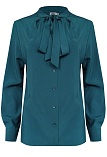 Романтичная блуза из шелковистой вискозной ткани в насыщенном зеленом цвете, средняя длина, приталенный силуэт, застежка на мелкие пуговицы, воротник стойка переходящий в декоративный галстук, который можно завязать на шее как бант, добавляя вариативности, бант создает акцент и добавляет элегантности, втачные рукава длиной 3/4 на узком манжете с функциональной петлей и пуговицей. Сочетание пиджака и банта на шее давно стало классикой, при этом оно оставляет пространство для эксперимента.
