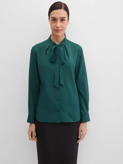 Романтичная блуза из шелковистой вискозной ткани в насыщенном зеленом цвете, средняя длина, приталенный силуэт, застежка на мелкие пуговицы, воротник стойка переходящий в декоративный галстук, который можно завязать на шее как бант, добавляя вариативности, бант создает акцент и добавляет элегантности, длинный втачной рукав на манжете с функциональной петлей и пуговицей. Сочетание пиджака и банта на шее давно стало классикой, при этом оно оставляет пространство для эксперимента.