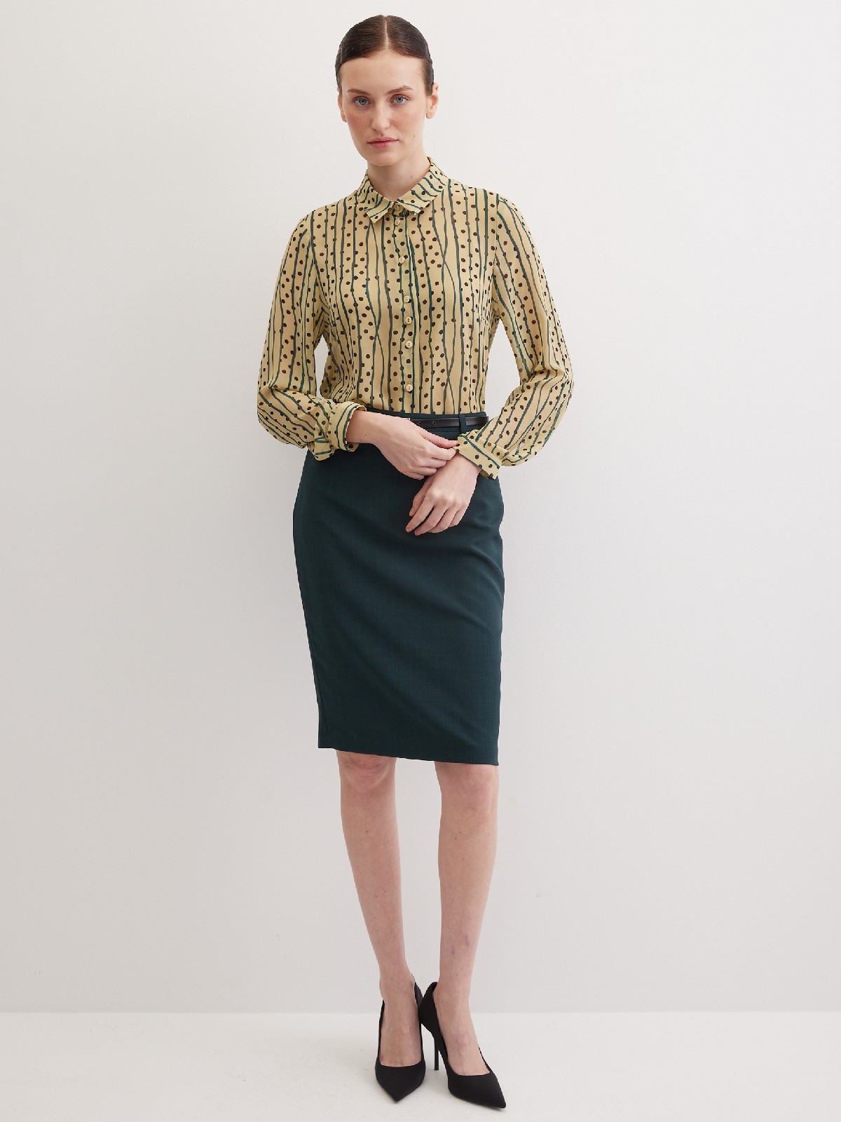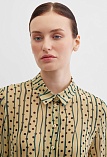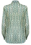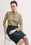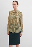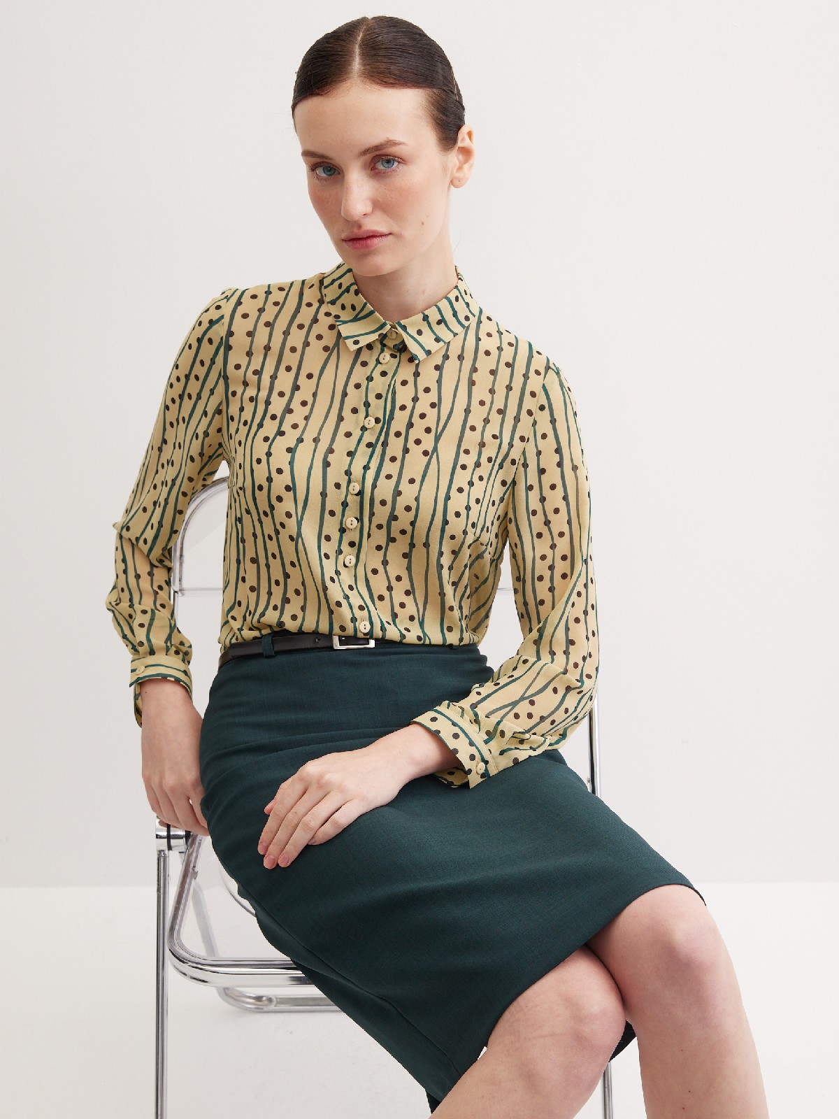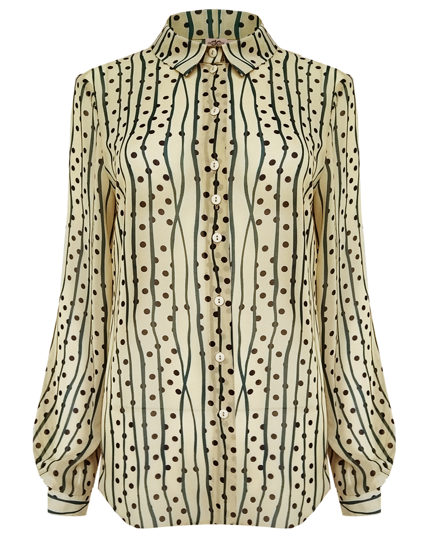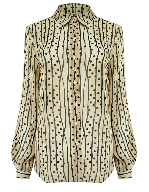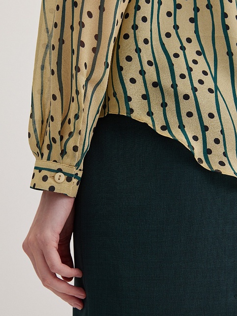 Многоцветная блуза из дышащей и воздушной шифоновой ткани создает ощущение легкости и свободы, приятна к телу, тактильно комфортна, скроена по типу классической рубашки, отсутствие вытачек по талии делает блузу более свободной, что обеспечивает хорошую посадку и комфорт, средняя длина, отложной рубашечный воротник, застежка на мелкие пуговицы, длинный втачной рукав  на манжете с функциональной петлей и пуговицей.