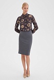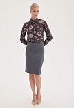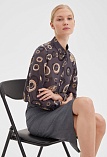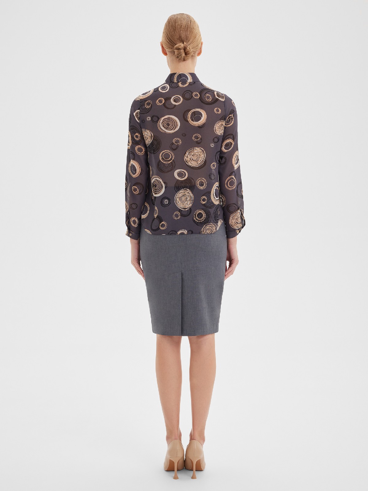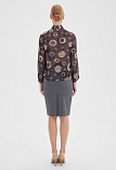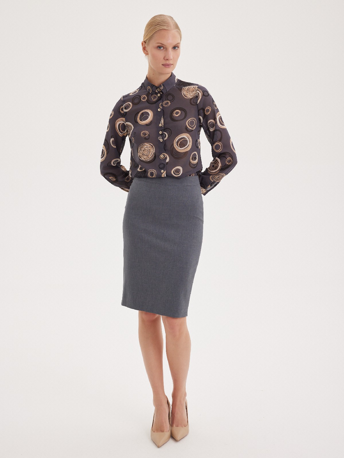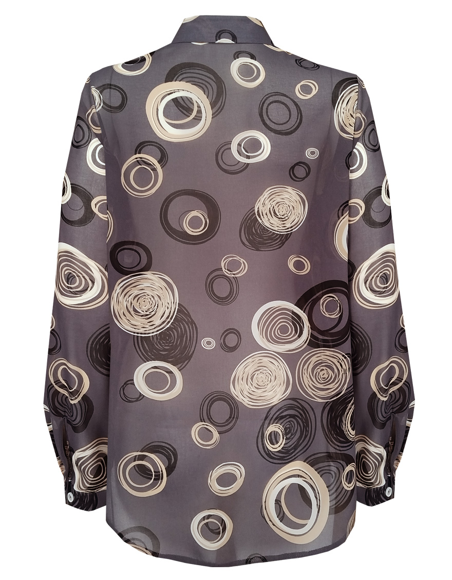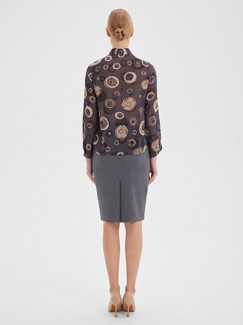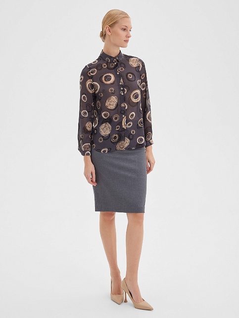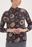 Раскошная блуза из полупрозрачного и воздушного материала с хаотично разбросанными золотистыми разводами на сером фоне, скроена по типу классической рубашки, приталенная, средняя длина, отложной рубашечный воротник, застежка на мелкие пуговицы, длинный втачной рукав на манжете с функциональной петлей и пуговицей. Блузка из такой ткани внешне очень красива, комфортна в носке и проста в уходе. Идеальный компаньон для однотонных вещей.