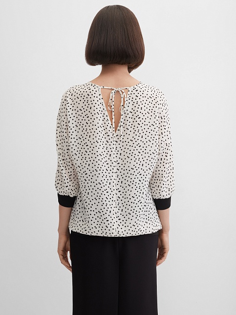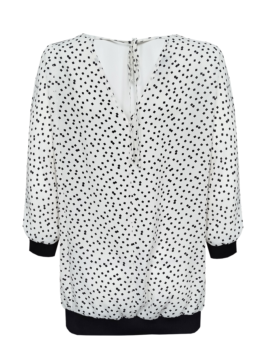 Белоснежная блуза с мелким геометрическим рисунком с цельнокроеным рукавом прекрасная альтернатива классической деловой блузке, подойдет на любой тип фигуры и скроет недостатки, средняя длина, V-образный вырез на спинке и круглый вырез по переду обработаны узким кантом, переходящий в завязки на спинке, такой необычный вырез поможет удлинить линию шеи, рукава 3/4 и низ изделия оформлены эластичной трикотажной резинкой, не привязывая изделие к определенному объему бедер и обхвату руки.