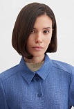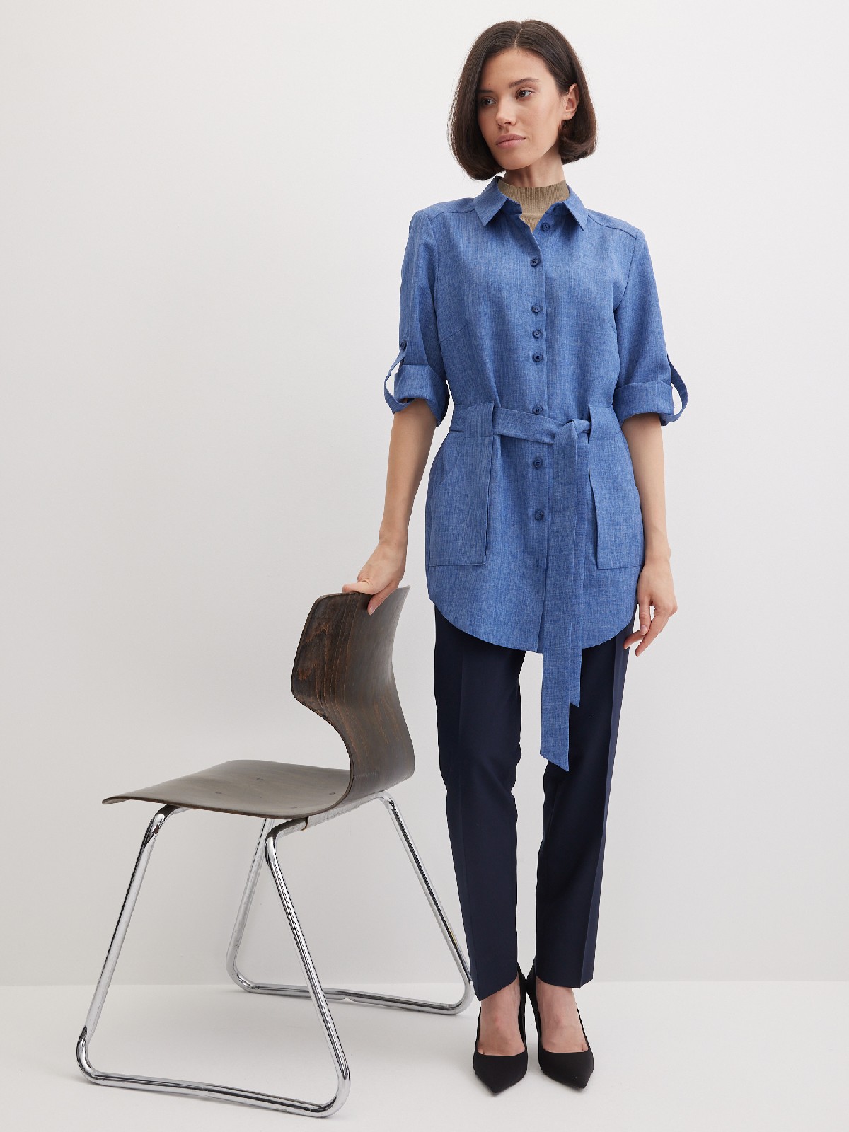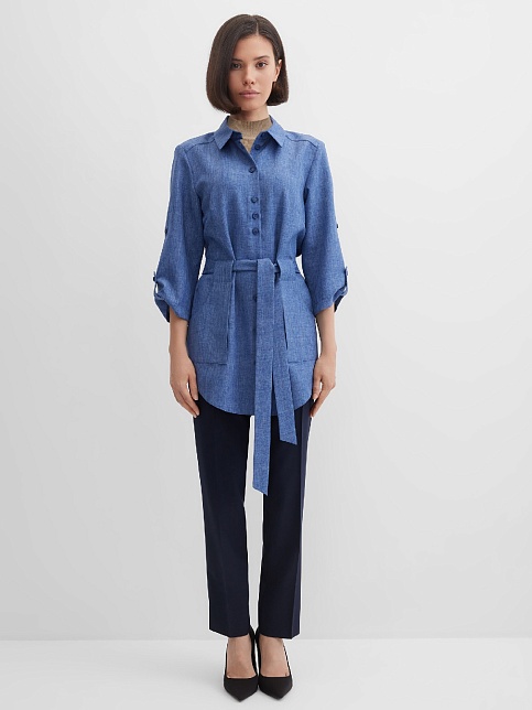 Блуза из смесовой ткани со льном синего цвета с меланжевым эффектом выполнена по типу легкого жакета без подкладки, удлиненная, свободная, приталенность создается за счет пояса, который фиксируется на талии, воротник рубашечный, цельнокроеная кокетка позволяет добиться хорошей посадки в области плеч, боковые карманы, застежка на пуговицы, рукав 3/4 с функциональной патой. Такую блузку можно носить как самостоятельное изделие или надеть поверх любого топа или платья, создав образ многослойности.
