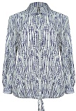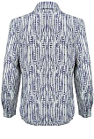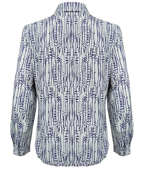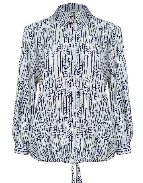 Повседневная блуза из легкой вискозной ткани в нежно-кремовом цвете с ярким абстрактным рисунком, приталенная, средняя длина, рубашечный воротник на стойке, застежка на мелкие пуговицы, по низу собирается на кулиску создавая умеренный объем, что придает удобство в носке, скрывает недостатки фигуры и не привязывает изделие к определенному объему бедер, втачной рукав 3/4 на манжете с застежкой на пуговицу.