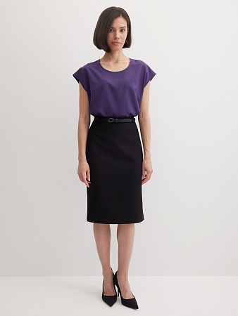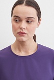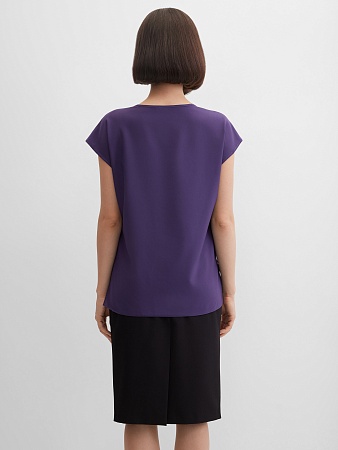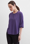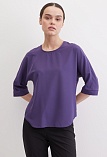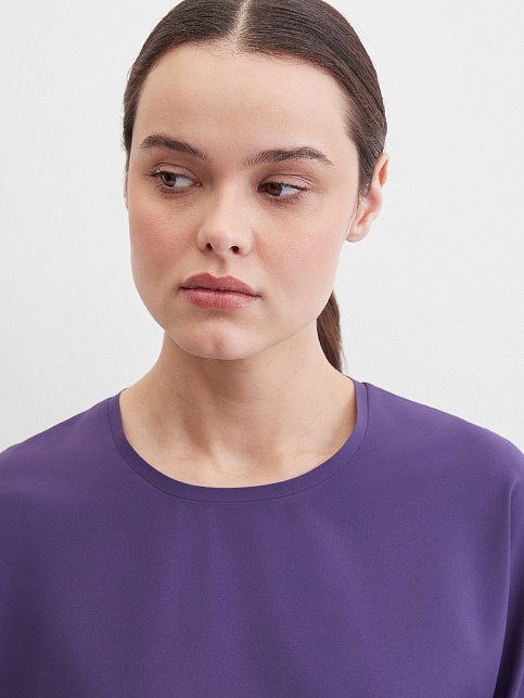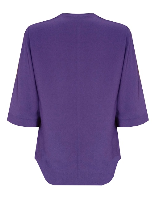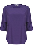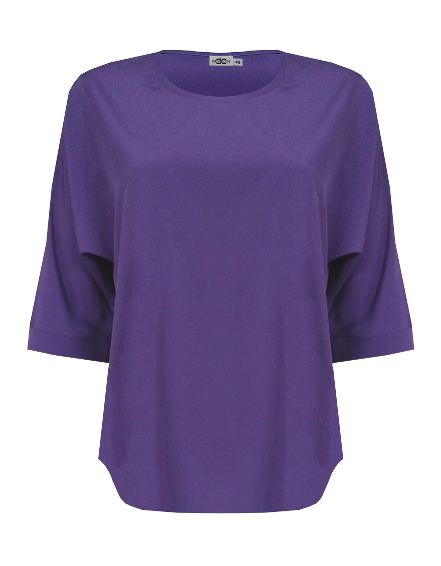 Универсальная блуза в благородном приглушенном фиолетовом цвете из легкой вискозной ткани с цельнокроеными рукавами "летучая мышь" умеренного объема, благодаря свободе и мягким линиям силуэта, такая блуза выгодно смотрится на женщинах любой комплекции, средняя длина, круглый вырез горловины обработан косой бейкой в цвет ткани, без застежки на пуговицы, рукава 3/4, фигурный низ позволяет создать более оригинальные и модные образы.