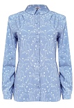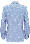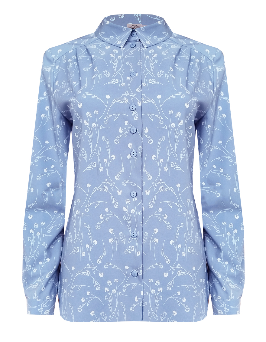 Блузка из струящейся поливискозной ткани в природном оттенке серо-голубого цвета в сочетании с эффектным белоснежным рисунком, средняя длина, приталенный силуэт, рубашечный воротник, цельнокроеная кокетка по спинке и полочке исключает плечевой шов и позволяет добиться хорошей посадки в области плеч, от кокетки спереди заложены мягкие складки умеренного объема, застежка на мелкие пуговицы, длинный втачной рукав на манжете с функциональной петлей и пуговицей.