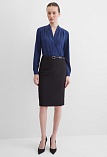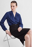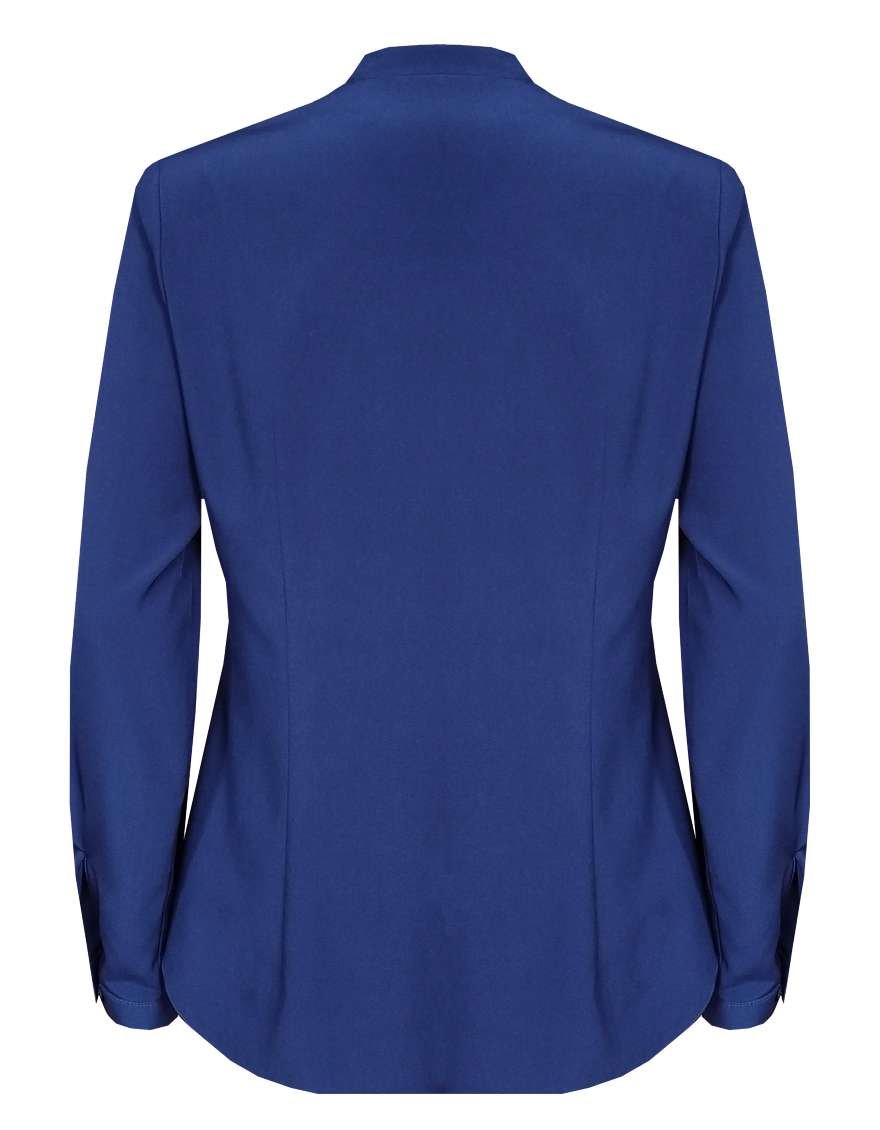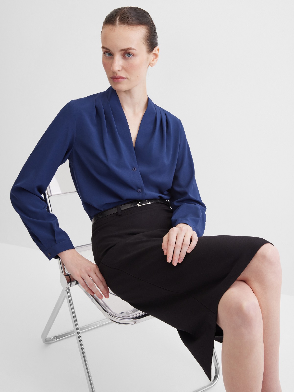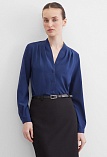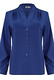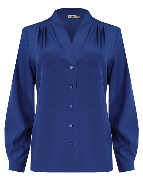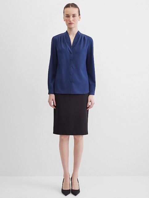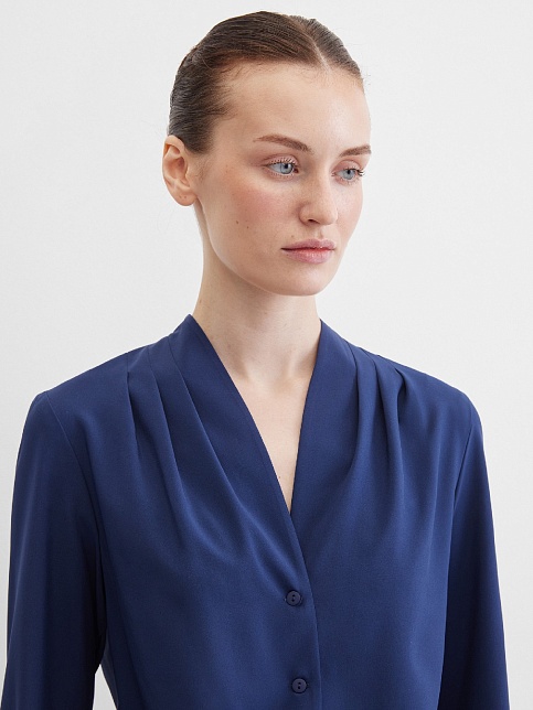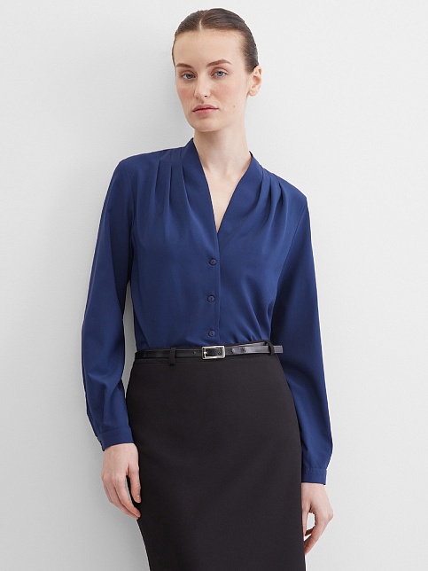 Повседневная практичная блуза из мягкой и струящейся вискозной ткани в классическом темно-синем цвете, средняя длина, ткань приятная на ощупь и проста в уходе, приталенный силуэт, V-образная горловина с цельнокроеным воротником и застроченными складками от плеча, застежка на мелкие пуговицы в цвет ткани, длинный втачной рукав на манжете с функциональной петлей и пуговицей.