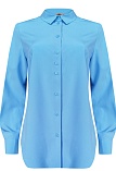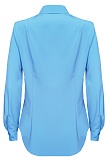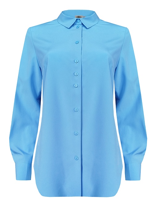 Универсальная блуза в одном из базовых оттенков голубого цвета, который создает ощущение стабильности и вызывает доверие, блузка скроена по типу классической рубашки, слегка приталенный силуэт визуально стройнит фигуру, средняя длина, отложной рубашечный воротник, застежка на мелкие пуговицы, длинный втачной рукав  на манжете с функциональной петлей и пуговицей.