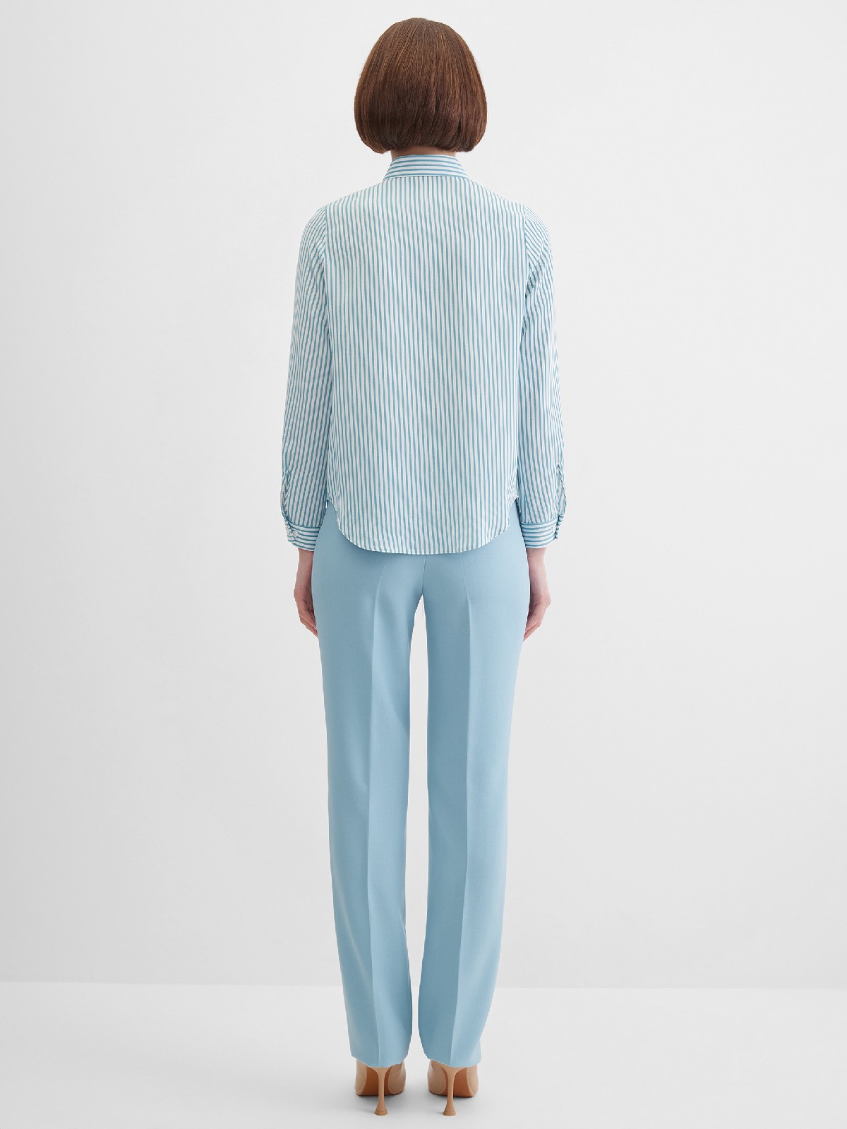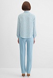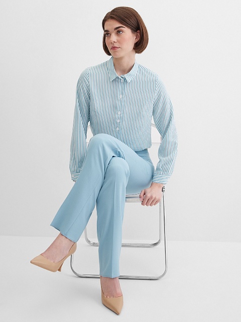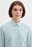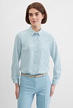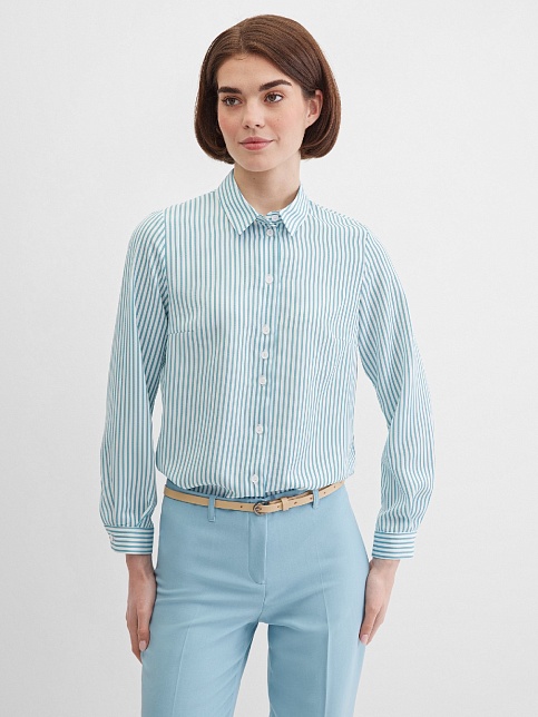 Комфортная блуза из смесовой хлопковой ткани, где в качестве натуральной основы преобладают хлопковые и вискозные волокна растительного происхождения, бирюзовые продольные полоски визуально стройнят и вытягивают фигуру, скроена по типу мужской рубашки, отсутствие талиевых вытачек создает умеренный объем и комфорт в движении, отложной воротник на небольшой стойке, застежка на мелкие пуговицы, слегка удлиненная с фигурным низом, длинный втачной рукав на манжете с функциональной петлей и пуговицей