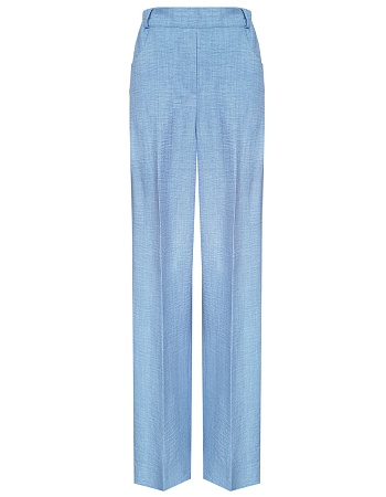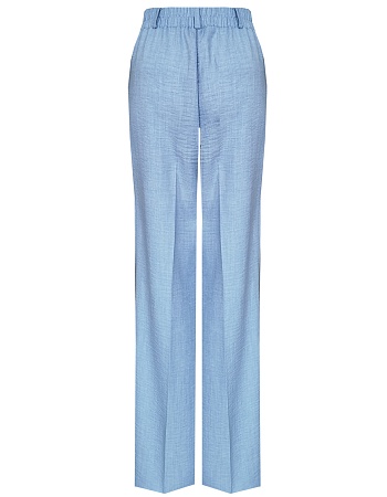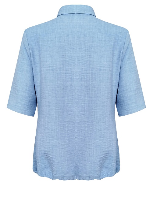 Блуза свободного силуэта из смесовой ткани с хлопком и вискозой в нежном оттенке небесно-голубого цвета с легким меланжевым эффектом, средняя длина, рубашечный воротник, застежка на пуговицы, по низу собирается на кулиску создавая умеренный объем, что придает удобство в носке, скрывает недостатки фигуры и не привязывает изделие к определенному объему бедер, короткий втачной рукав. Такая ткань отлично пропускает воздух, позволяя коже дышать, что делает ее идеальной для теплого времени года.