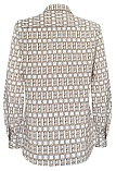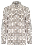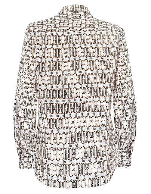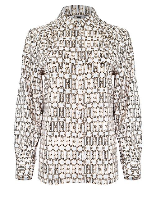 Блузка из струящейся поливискозной ткани с дизайнерским узором, имитирующий переплетение звеньев золотых цепочек, цепной принт эффектный, роскошный и узнаваемый, средняя длина, приталенный силуэт, рубашечный воротник, цельнокроеная кокетка по спинке и полочке исключает плечевой шов и позволяет добиться хорошей посадки в области плеч, от кокетки спереди заложены мягкие складки умеренного объема, застежка на пуговицы, длинный втачной рукав на манжете с функциональной петлей и пуговицей.