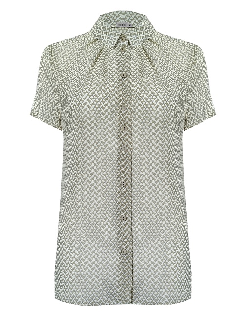 Универсальная блуза в нежной расцветке для весеннего и летнего гардероба из воздушного и полупрозрачного материала с одним из самых актуальных и модных рисунков в стиле абстрактной геометрии, средняя длина, приталенная, отложной рубашечный воротник на стойке, по горловине спереди заложены мягкие складки, добавляя модели декоративности и элегантности, застежка на  пуговицы, втачные короткие рукава. Геометрический принт подходит для любого возраста, придают образу графичности, структуры и стиля.