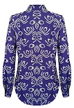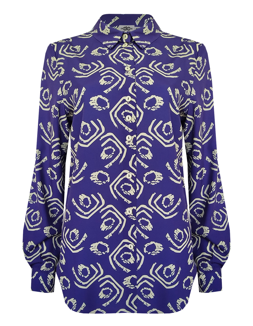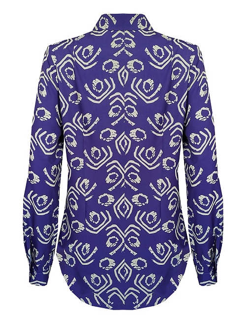 Блуза с ярко-желтым принтом на фиолетовом фоне - это динамичное и контрастное сочетание цветов, которое создает яркий и запоминающийся визуальный эффект, такое сочетание моментально приковывает взгляд и используется для создания смелых и ярких образов, скроена по типу классической рубашки, приталенная, средняя длина, отложной рубашечный воротник, застежка на мелкие пуговицы, длинный втачной рукав  на манжете с функциональной петлей и пуговицей.