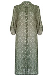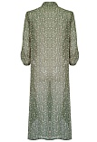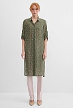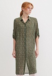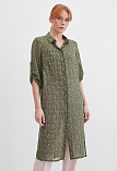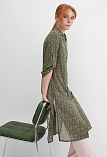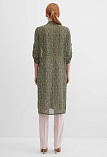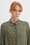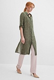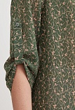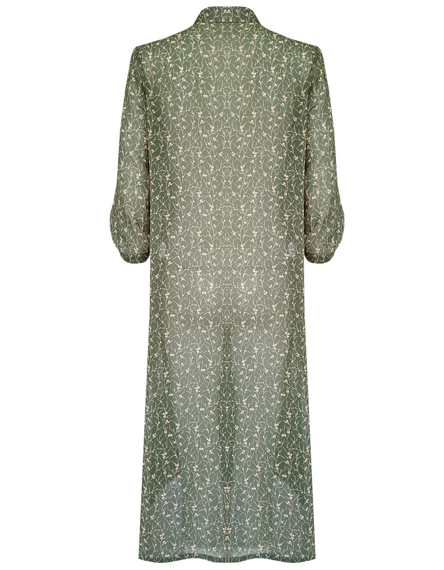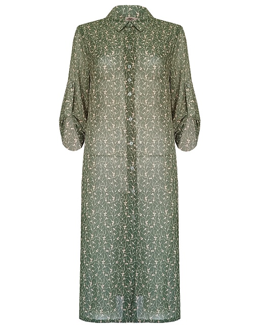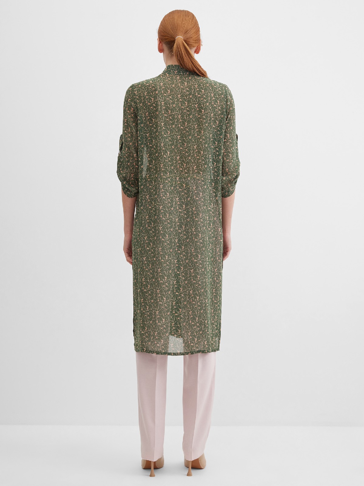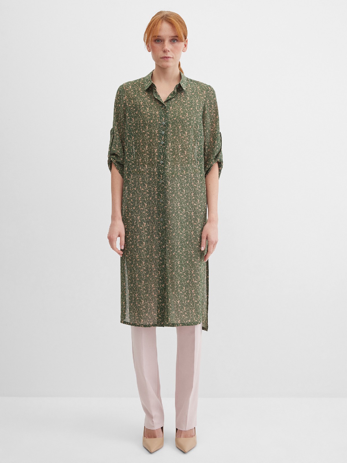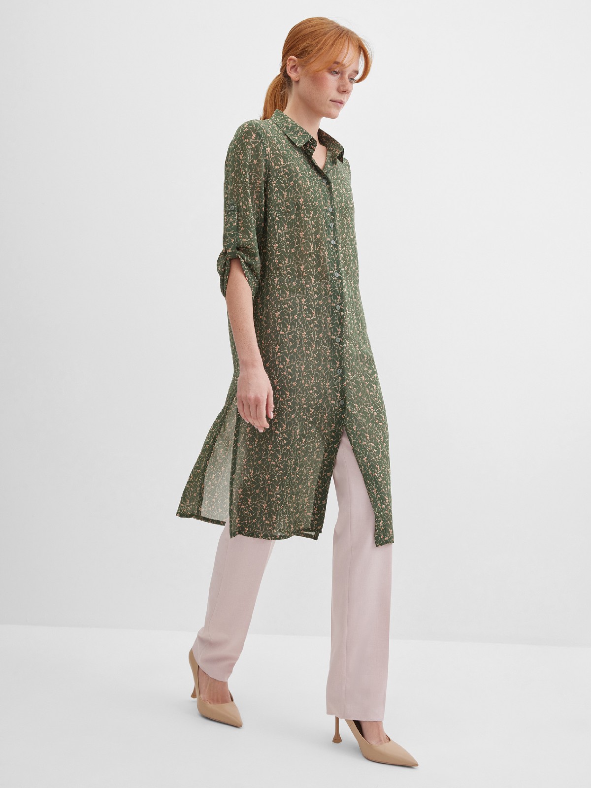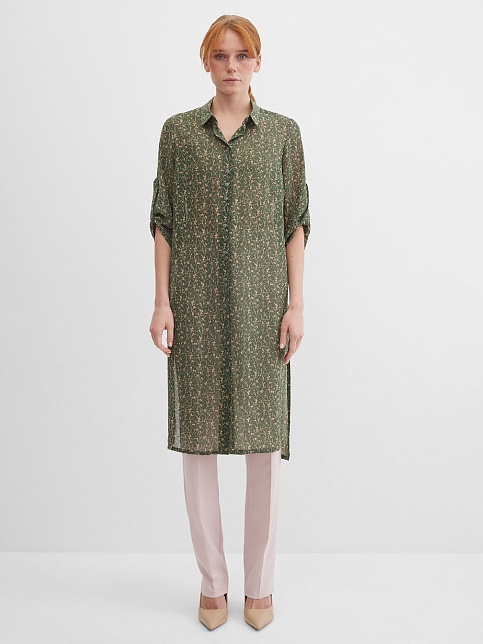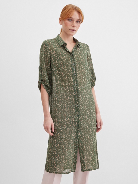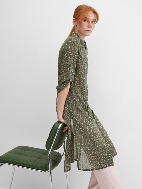Свободная блузка-туника или блузка-рубашка из воздушной и полупрозрачной шифоновой ткани в изысканной расцветке с винтажно-зеленым фоном и нежными цветами, свободный крой, отложной воротник, застежка на пуговицы, прямой низ, разрезы по бокам, втачной рукав 3/4 с функциональной патой, длина макси - ниже колена.Такую блузку можно надеть поверх любого топа или платья, и может быть частью ансамбля с брюками или юбкой.