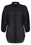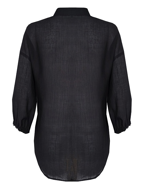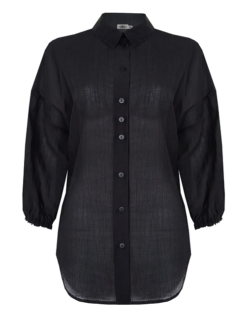 Комфортная блуза в базовом черном цвете из фактурной ткани "жатка" с характерной легкой "помятостью", спущенная линия плеча выглядит мягче и уютнее, особый крой без вытачек придает изделию свободный и расслабленный вид, отложной воротник, удлиненная с фигурным низом, застежка на пуговицы, рукав 3/4 собран на резинку. Модель актуальна для женщин любого размера и телосложения, даже если фигура далека от идеала. Уход не требует особых усилий и является удобным вариантом для повседневной носки.
