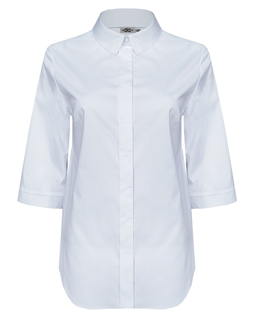 Универсальная блузка рубашка из невесомой сорочечной ткани в базовом белом цвете скроена по типу классической рубашки без лишних деталей и броского декора, легкая приталенность за счет талиевых вытачек по спинке, отложной рубашечный воротник на стойке, застежка на пуговицы, воротник и манжеты декоративно отстрочены, средняя длина с фигурным низом, втачной рукав 3/4 с манжетом.