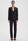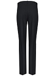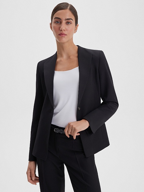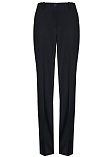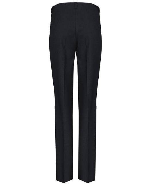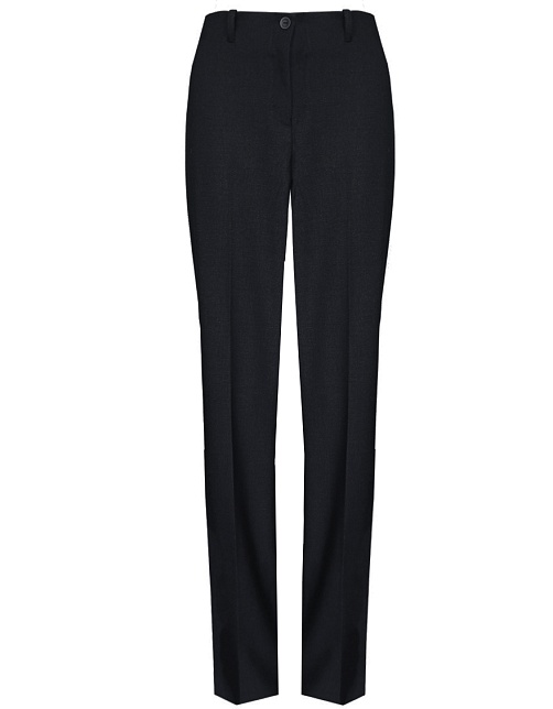 Классические черные брюки прямого кроя из поливискозной ткани, без пояса, с талиевыми вытачками и шлевками под ремень, посадка средняя, застежка на молнию и пуговицу спереди, заутюженные стрелки, низ обработан от осыпания ткани, но не подогнут - это позволяет скорректировать длину брюк под свой рост, без подкладки и карманов. Резинка на поясе обеспечивает комфортную посадку, не передавливает тело и позволяет свободно двигаться.