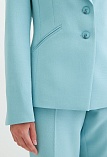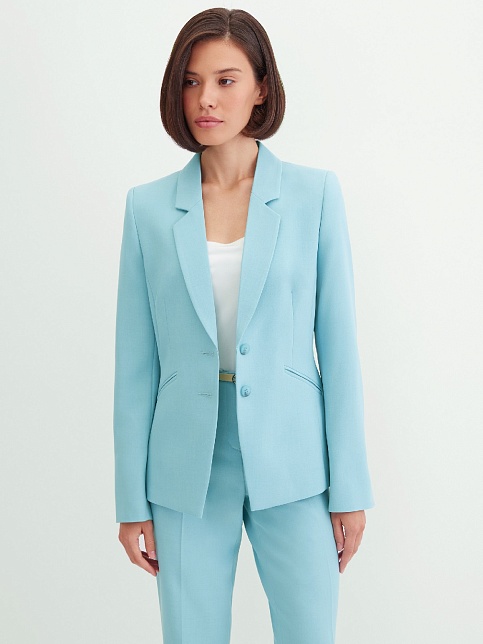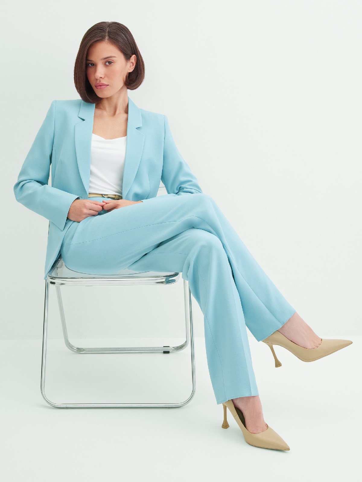 Классические брюки прямого кроя из поливискозной ткани в пастельно-бирюзовом цвете выглядят нежно и освежающе, модель без пояса, с талиевыми вытачками и шлевками под ремень, посадка средняя, застежка на молнию и пуговицу спереди, заутюженные стрелки, низ обработан от осыпания ткани, но не подогнут - это позволяет скорректировать длину брюк под свой рост, без подкладки и карманов. Поливискозная ткань - это смесовая ткань, в состав которой входят волокна вискозы и полиэстера.