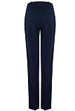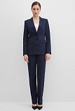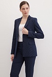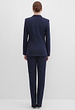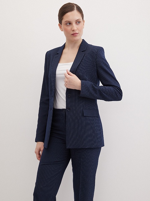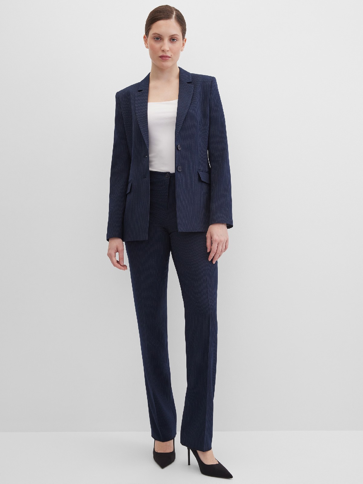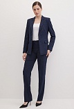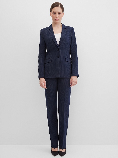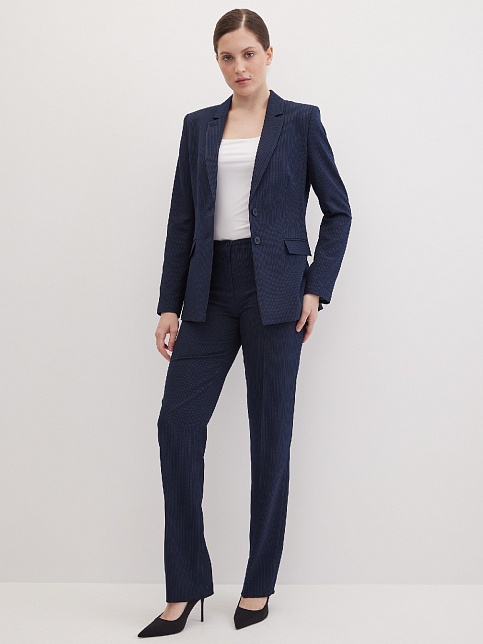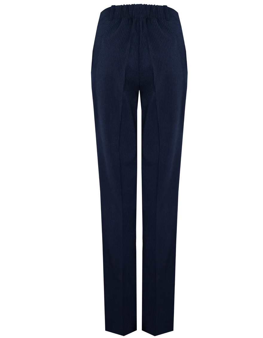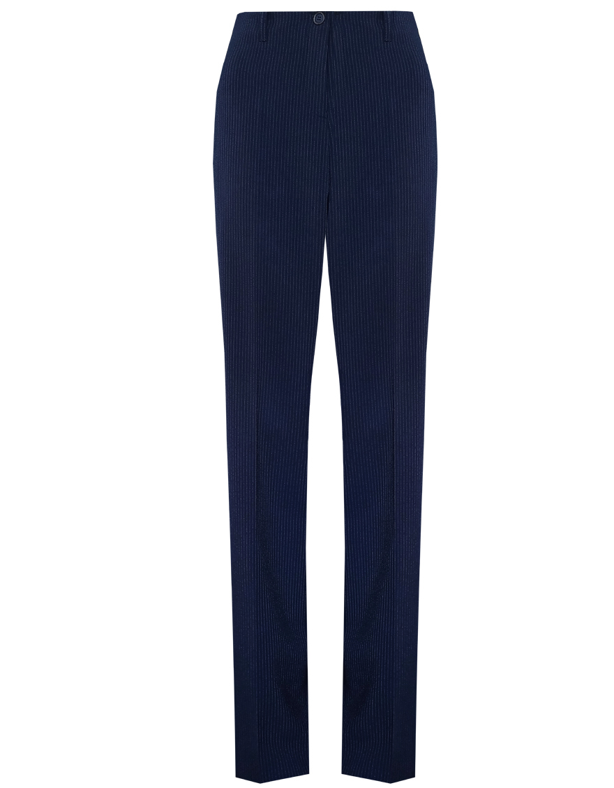 Классические брюки прямого кроя из поливискозной ткани темно-синего цвета в тонкую, почти невидимую полоску, удобная резинка в поясе брюк по талии не впивается в живот, обеспечивает удобство и комфорт, не стесняя и не вызывая дискомфорта, шлевки под ремень, посадка средняя, застежка на молнию и пуговицу спереди, заутюженные стрелки, низ обработан от осыпания ткани, но не подогнут - это позволяет скорректировать длину брюк под свой рост, без подкладки и карманов.