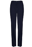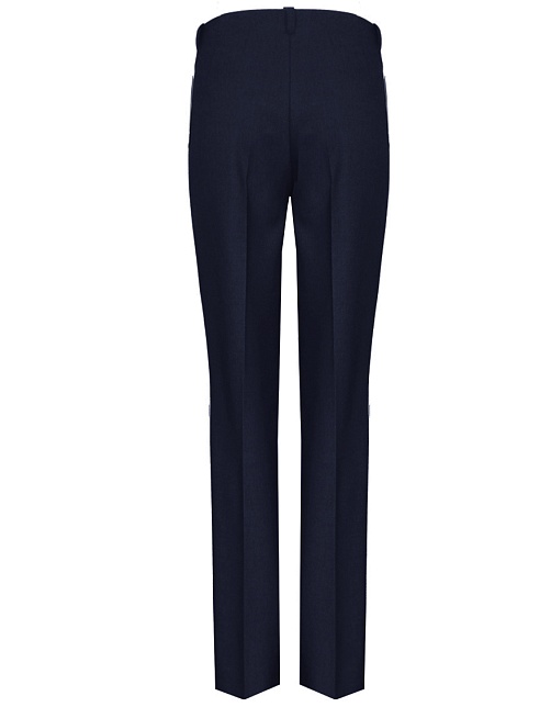 Классические брюки прямого кроя из поливискозной ткани темно-синего цвета, шлевки под ремень, посадка средняя, застежка на молнию и пуговицу спереди, заутюженные стрелки, низ обработан от осыпания ткани, но не подогнут - это позволяет скорректировать длину брюк под свой рост, без подкладки и карманов. Поливискозная ткань - смесовая ткань, в состав которой входят волокна вискозы и полиэстера.