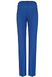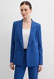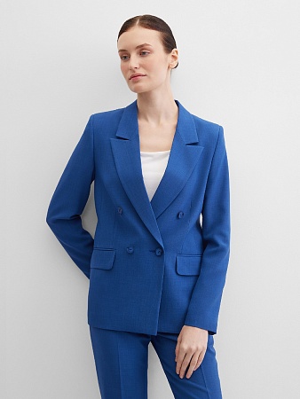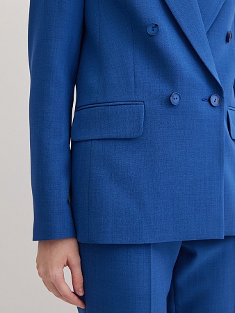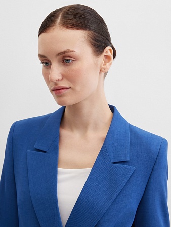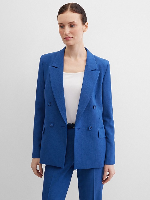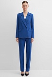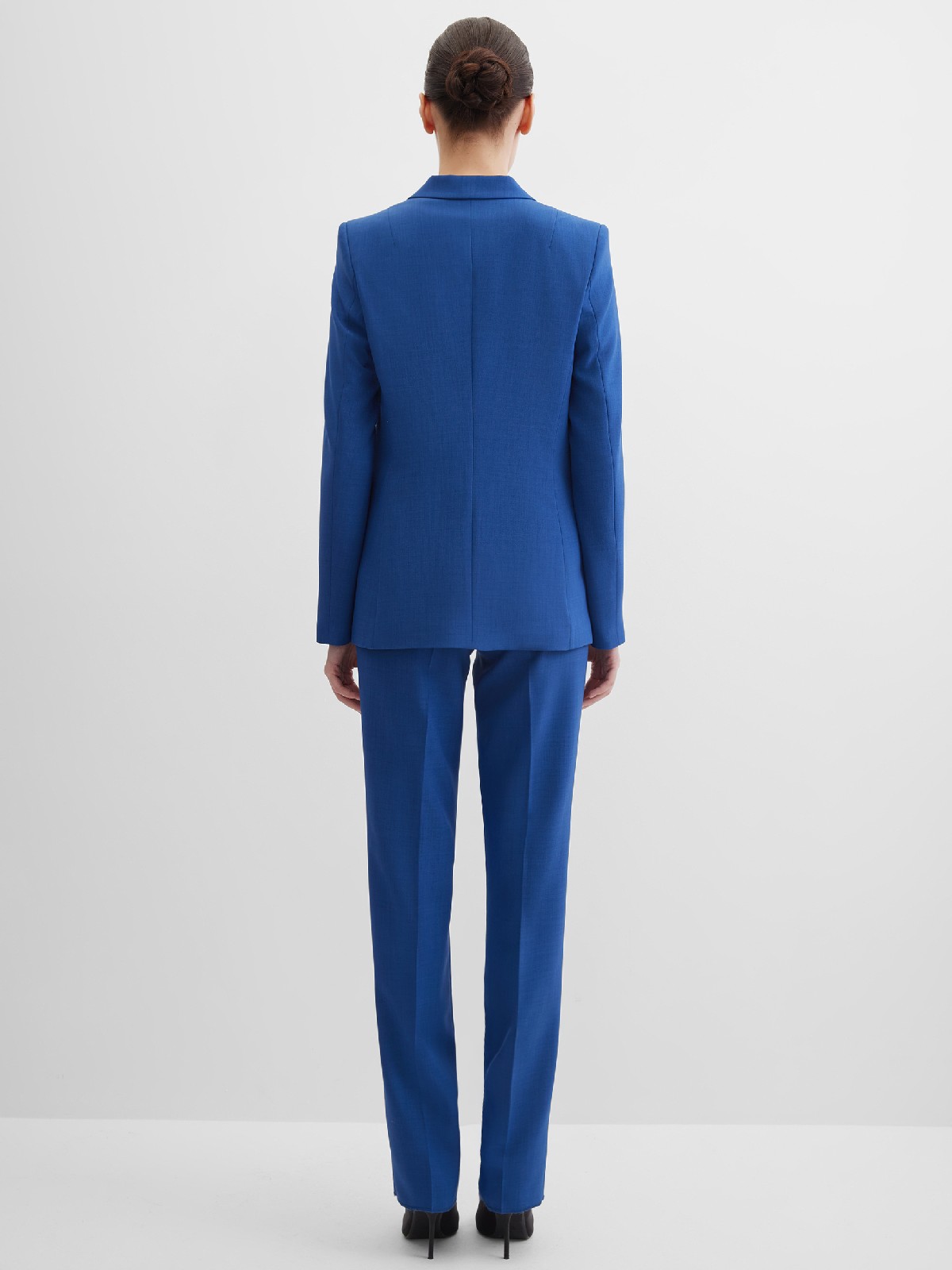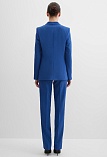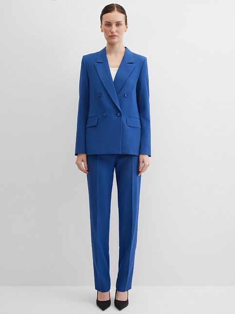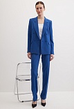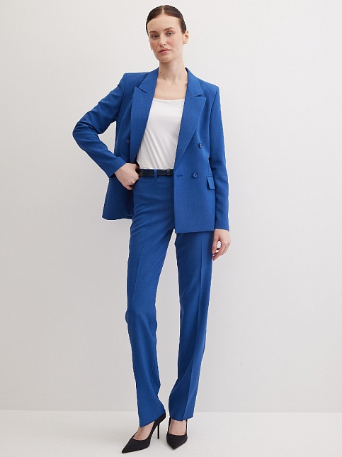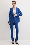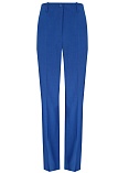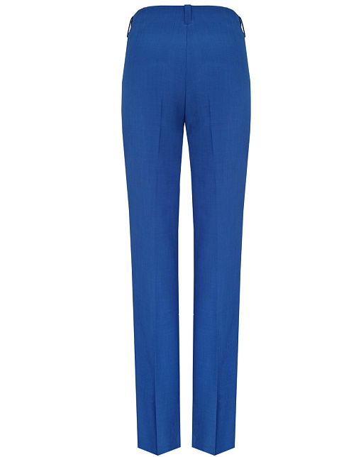 Классические брюки прямого кроя из поливискозной ткани в насыщенно синем цвете, модель без пояса, с талиевыми вытачками и шлевками под ремень, посадка средняя, застежка на молнию и пуговицу спереди, заутюженные стрелки, низ обработан от осыпания ткани, но не подогнут - это позволяет скорректировать длину брюк под свой рост, без подкладки и карманов. Поливискозная ткань - это смесовая ткань, в состав которой входят волокна вискозы и полиэстера. Ткань практически не подвержена истиранию.