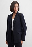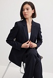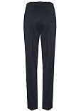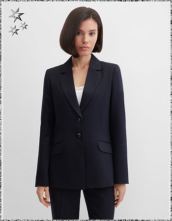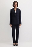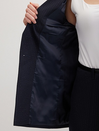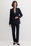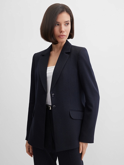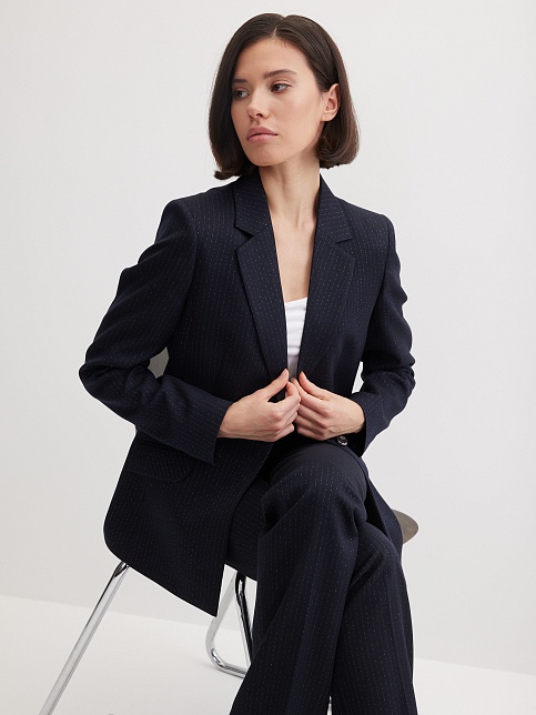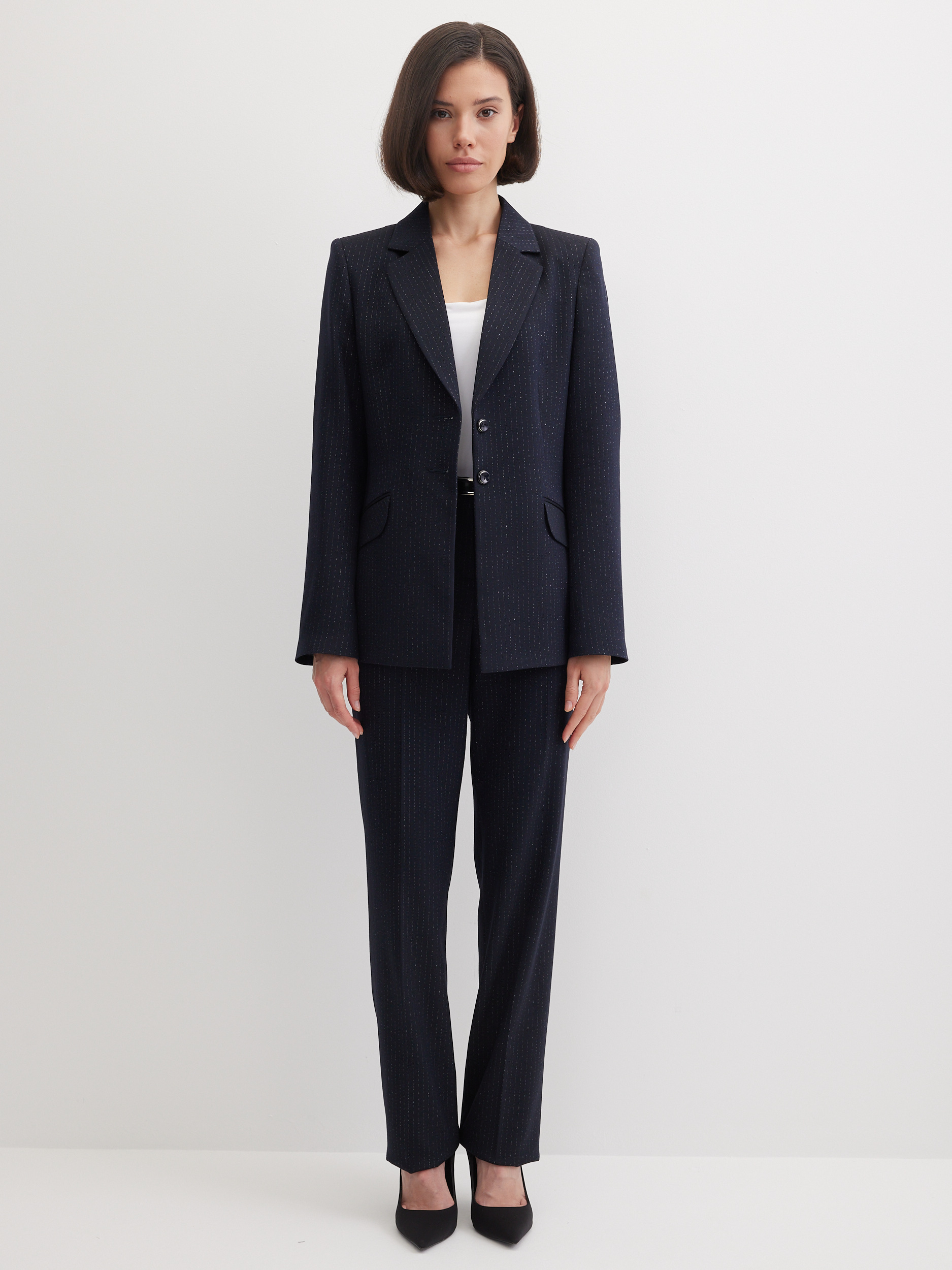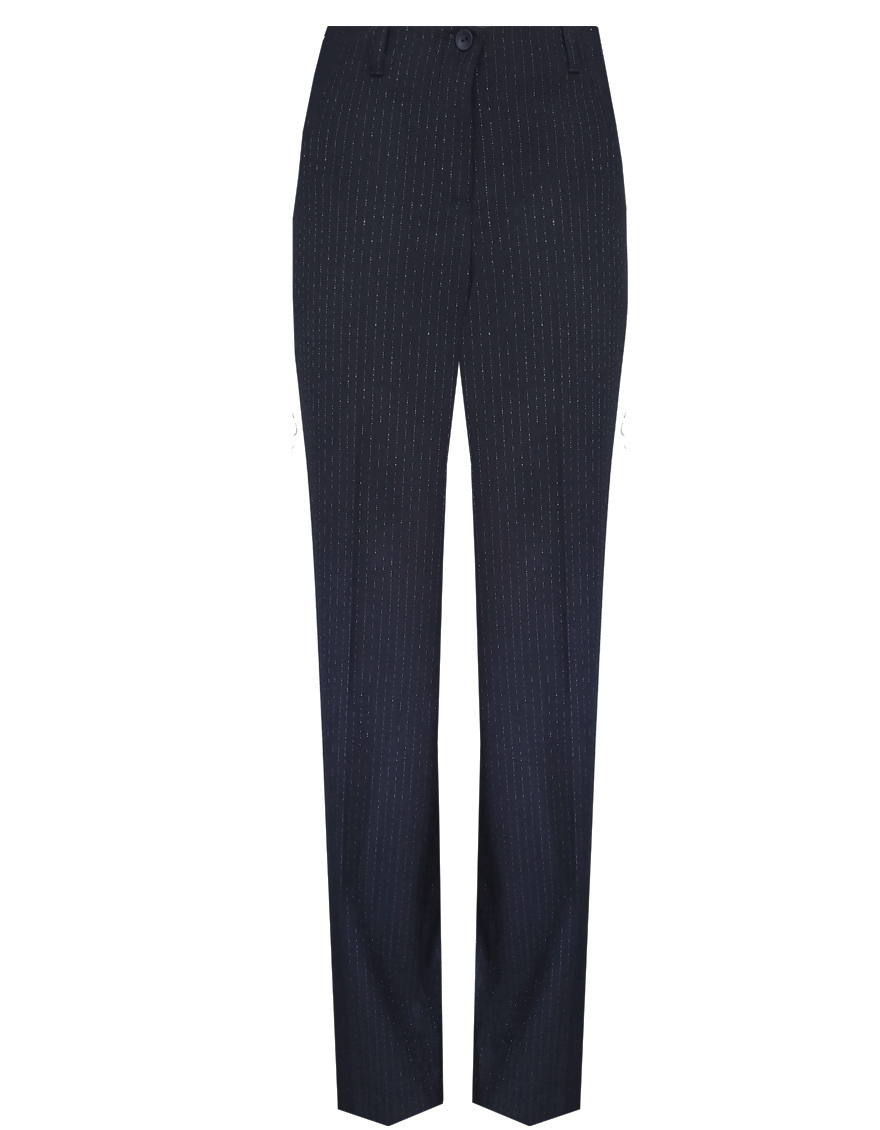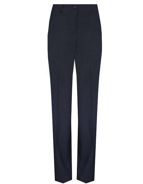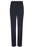 Классические брюки прямого кроя из поливискозной ткани темно-синего цвета в мерцающую серебристую полоску с утонченным блеском, удобная резинка в поясе брюк по талии сзади обеспечивает удобство и комфорт, не стесняя и не вызывая дискомфорта, шлевки под ремень, посадка средняя, застежка на молнию и пуговицу спереди, заутюженные стрелки, низ обработан от осыпания ткани, но не подогнут - это позволяет скорректировать длину брюк под свой рост, без подкладки и карманов.