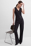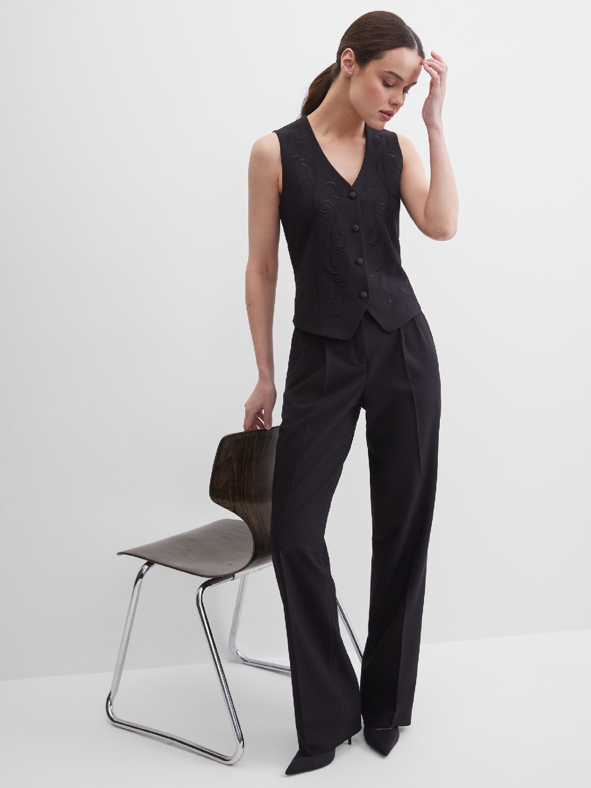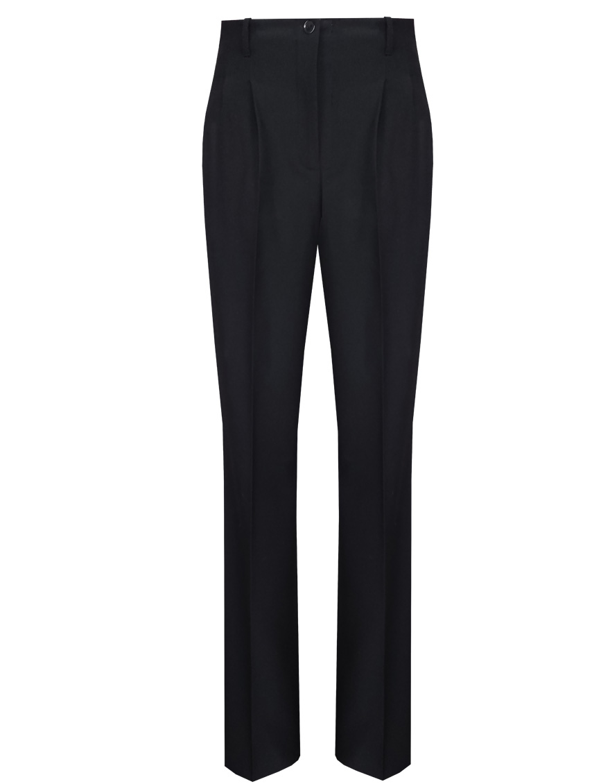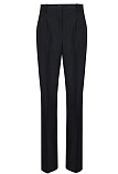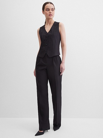 Брюки свободного кроя из премиальной костюмной ткани высокого качества в базовом черном цвете, средняя посадка, без пояса, на внутренней обтачке и шлевками под ремень, застежка на молнию и пуговицу спереди, умеренно объемные в области бедер за счет складок по передней части, боковые карманы с отрезным бочком, заутюженные стрелки, низ обработан от осыпания ткани, но не подогнут - что позволяет скорректировать длину брюк под свой рост, без карманов и подкладки.