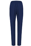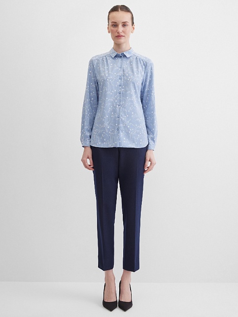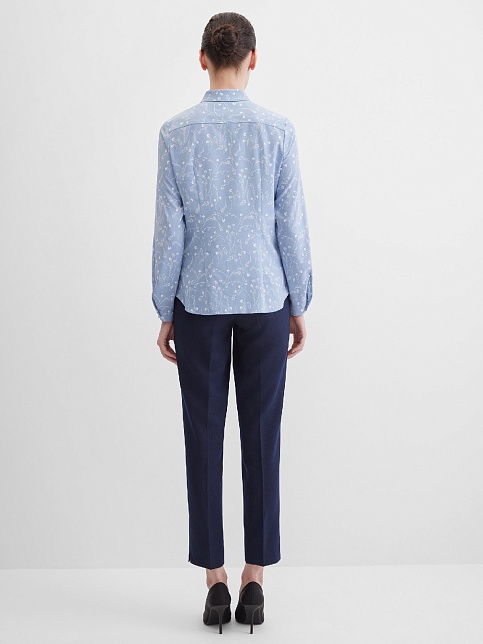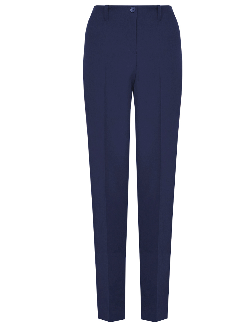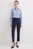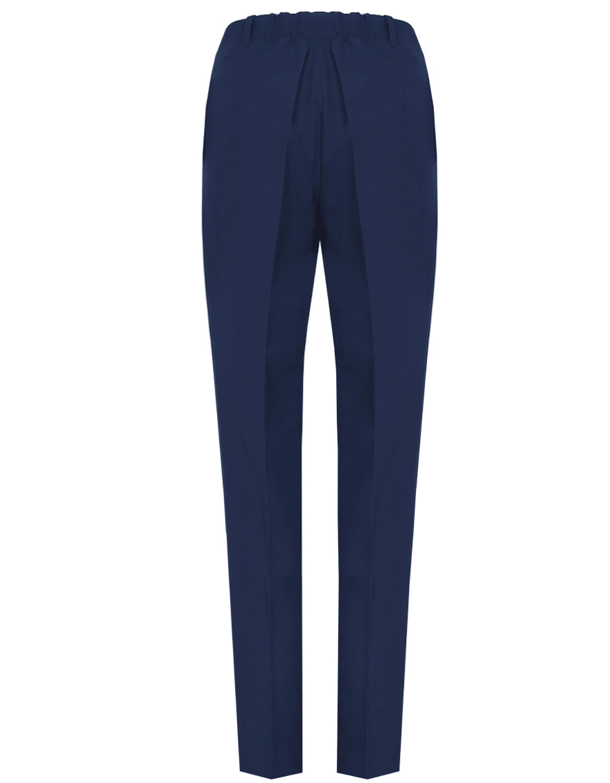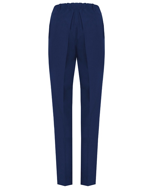 Классические брюки зауженные книзу темно-синего цвета из смесовой ткани с небольшим количеством шерсти в составе, средняя посадка, удобная резинка по талии сзади  обеспечивает удобство и комфорт в носке, не стесняя и не вызывая дискомфорта, без пояса, на внутренней обтачке, шлевки под ремень, застежка на молнию и пуговицу спереди, заутюженные стрелки, без карманов и подкладки, небольшие боковые разрезы внизу.