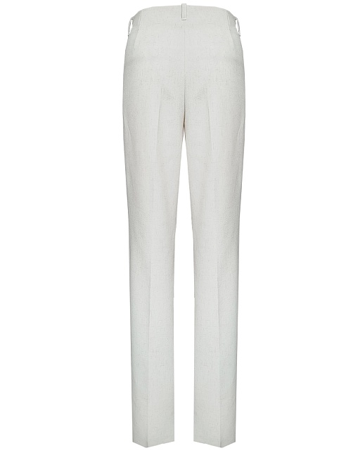 Брюки прямого кроя из поливискозной ткани в мягком жемчужном оттенке с едва заметным переливающимся сиянием перламутрового, модель без пояса, с талиевыми вытачками и шлевками под ремень, посадка средняя, застежка на молнию и пуговицу спереди, заутюженные стрелки, низ обработан от осыпания ткани, но не подогнут - это позволяет скорректировать длину брюк под свой рост, без подкладки и карманов. Брюки из такой ткани не так сильно мнутся, более долговечны, легки в уходе, устойчивы к выцветанию.