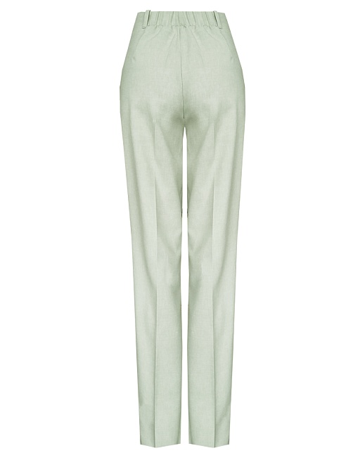 Легкие классические брюки прямого кроя из смесовой ткани льняной структуры в нежном и приглушенном оттенке зеленого, удобная резинка по талии обеспечивает удобство и комфорт, не стесняя и не вызывая дискомфорта, шлевки под ремень, посадка средняя, застежка на молнию и пуговицу спереди, заутюженные стрелки, низ обработан от осыпания ткани, но не подогнут - это позволяет скорректировать длину брюк под свой рост, без подкладки и карманов. Такая ткань отлично пропускает воздух, позволяя коже дышать