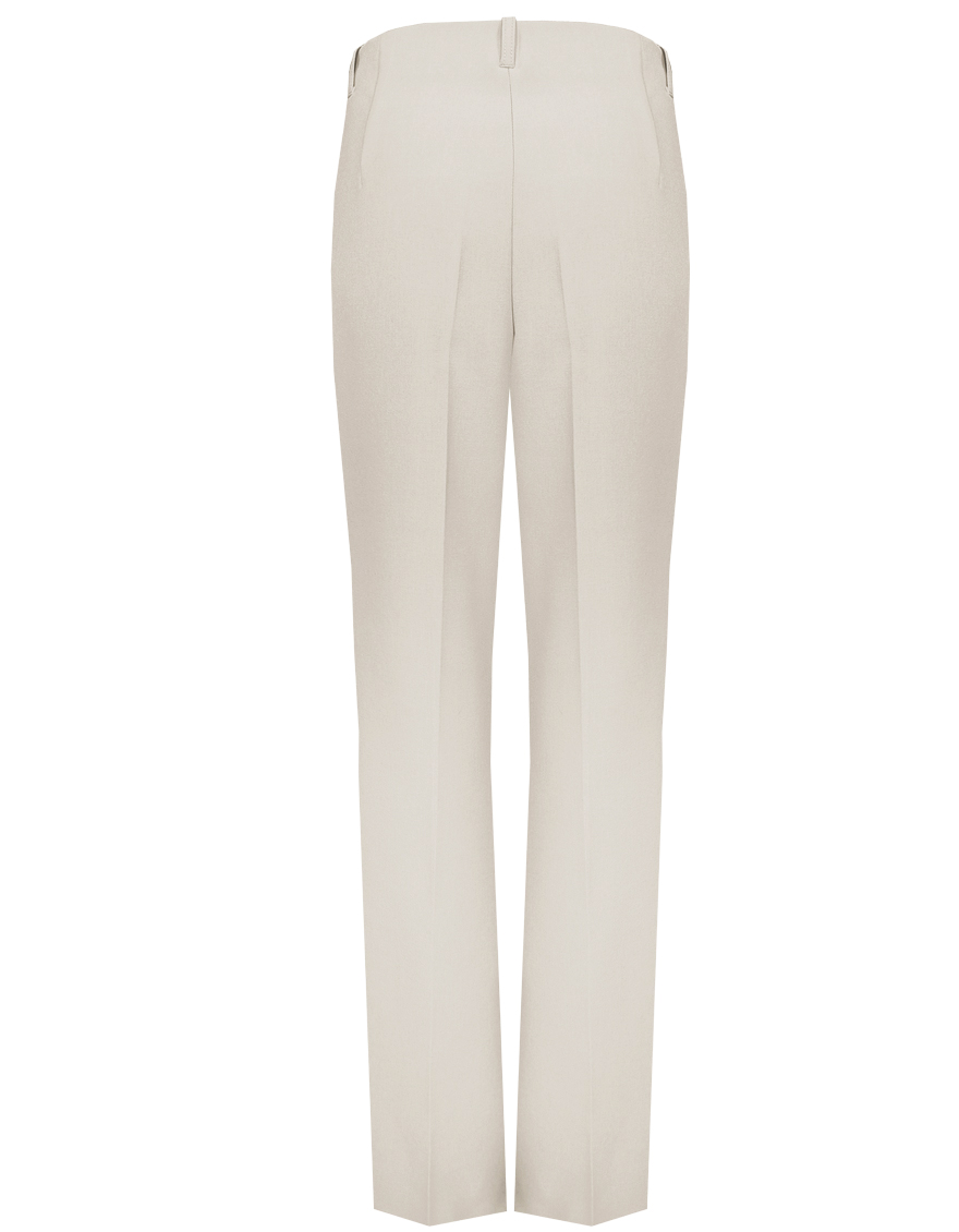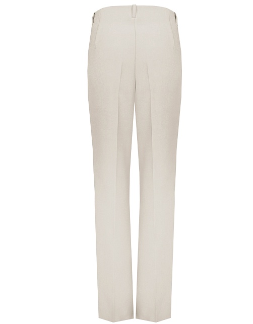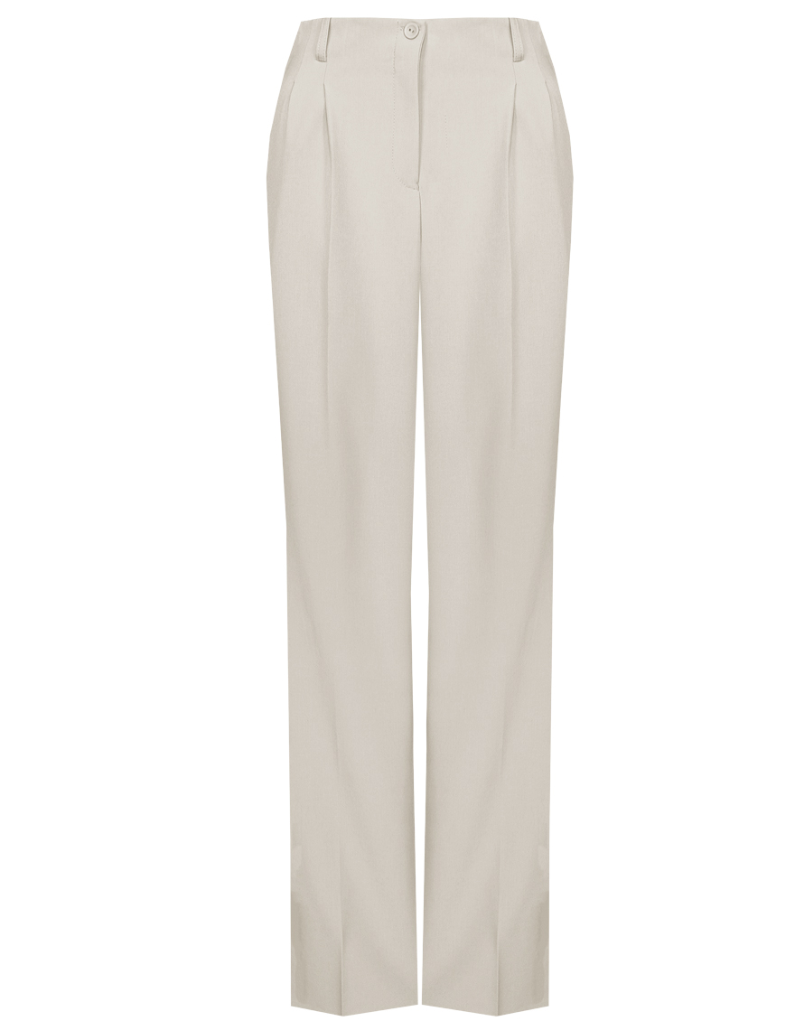 Легкие брюки свободного кроя из смесовой ткани льняной структуры в легком и воздушном сливочно-кремовом цвете, средняя посадка, без пояса, на внутренней обтачке и шлевками под ремень, застежка на молнию и пуговицу спереди, умеренный объем в области бедер за счет складок по передней части, боковые карманы с отрезным бочком, заутюженные стрелки, низ обработан от осыпания ткани, но не подогнут - что позволяет скорректировать длину брюк под свой рост, без карманов и подкладки.
