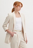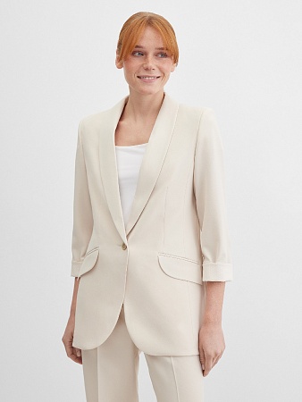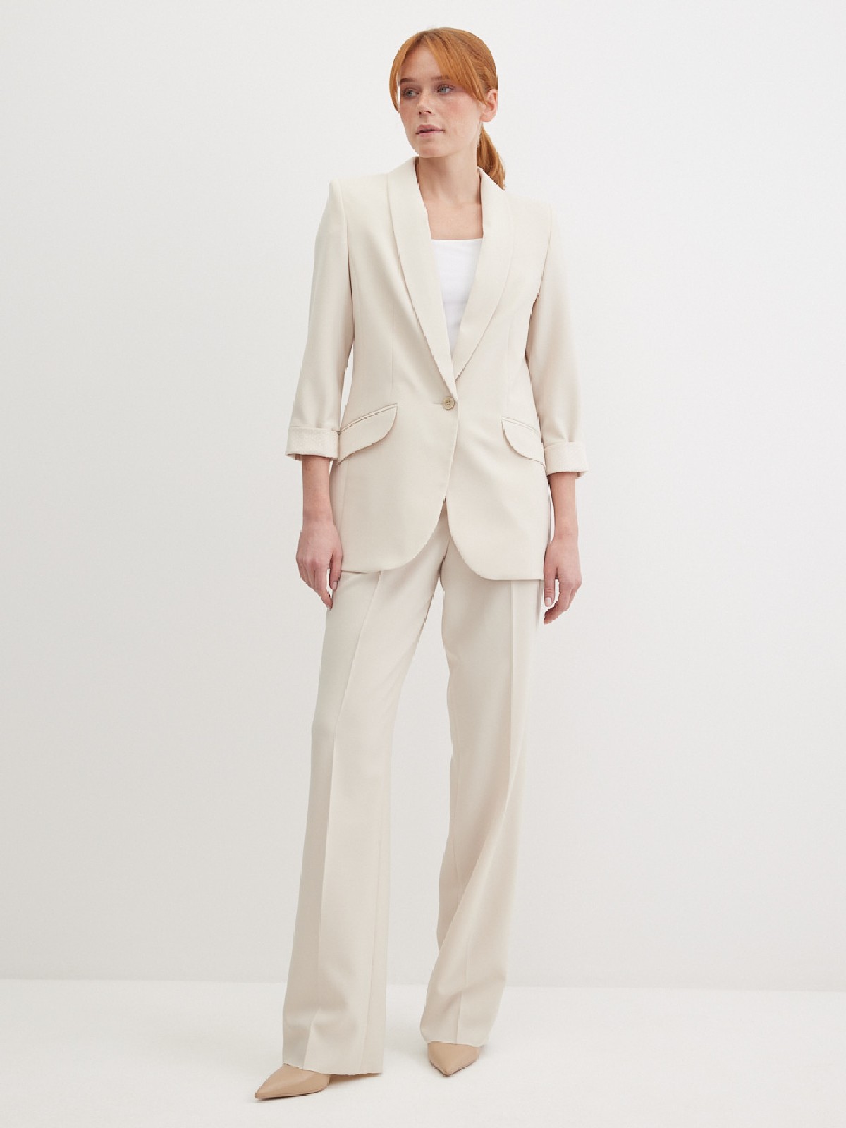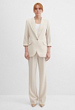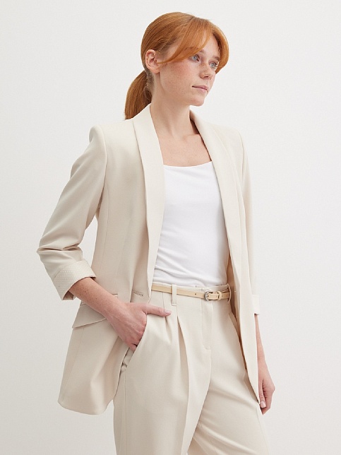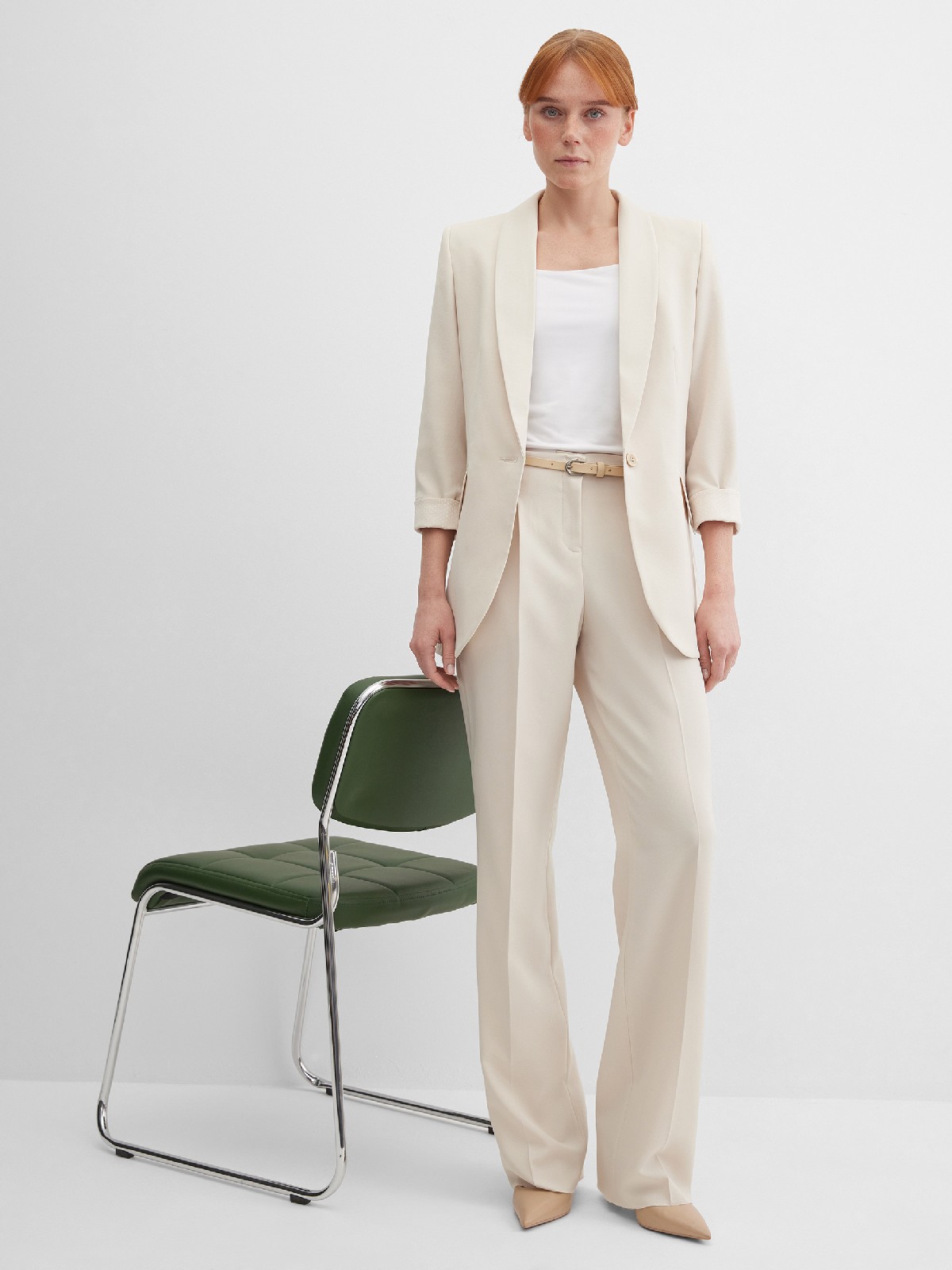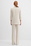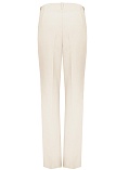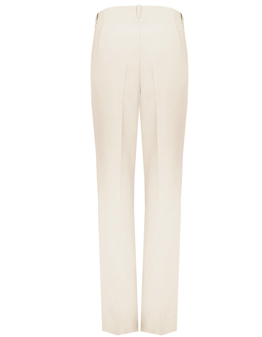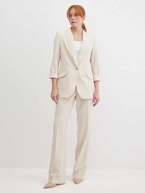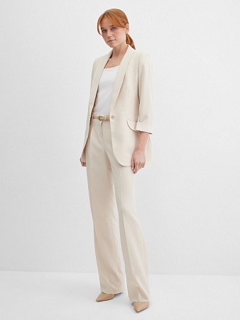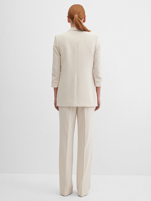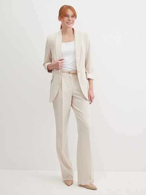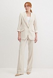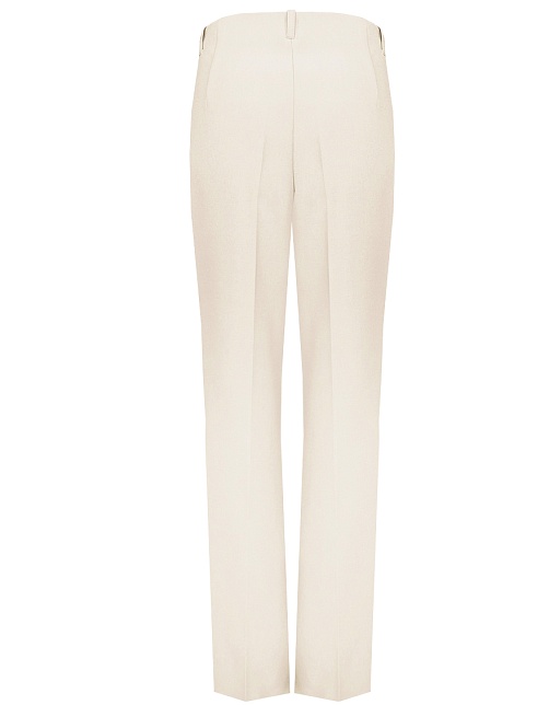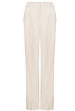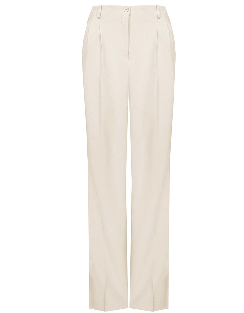 Легкие брюки свободного кроя из смесовой ткани льняной структуры в легком и воздушном сливочно-кремовом цвете, средняя посадка, без пояса, на внутренней обтачке и шлевками под ремень, застежка на молнию и пуговицу спереди, умеренный объем в области бедер за счет складок по передней части, боковые карманы с отрезным бочком, заутюженные стрелки, низ обработан от осыпания ткани, но не подогнут - что позволяет скорректировать длину брюк под свой рост, без карманов и подкладки.