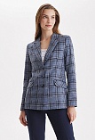 Лаконичный жакет из поливискозной ткани голубого цвета с элегантным переплетением темно-синих и едва заметных белых полос, по своим конструктивным особенностям можно смело отнести к мужскому стилю, удлиненный, приталенный, однобортный, английский воротник, прорезные карманы с клапаном, прямой борт, общий подкройной бочок у спинки и полочки, т.е. без бокового шва,застежка на пуговицы, длинный втачной рукав, тонкие подплечники, модель на подкладке. Фишка модели - безупречная посадка!