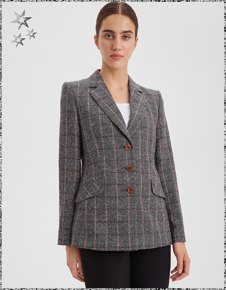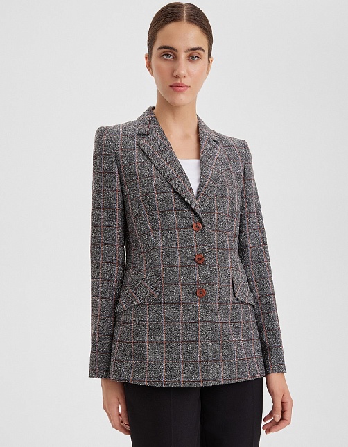 Клетчатый жакет из поливискозной ткани с переплетением нитей контрасных цветов и замысловатой фактурой придает ткани меланжевый эффект, а изделию уникальный внешний вид, слегка удлиненный, приталенный, однобортный, английский воротник, прорезные карманы с клапаном, прямой борт, застежка на пуговицы, без шлицы, длинный втачной рукав, тонкие подплечники, модель на подкладке. Поливискозная ткань - смесовая ткань, в состав которой входят волокна вискозы и полиэстера.