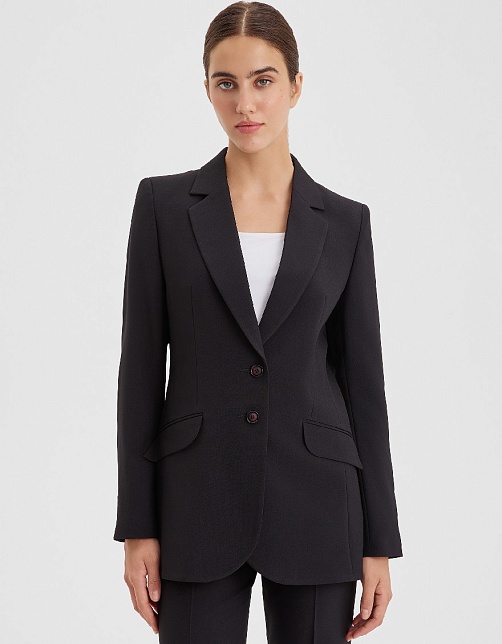 Классический жакет из поливискозной ткани в базовом черном цвете, комфортная длина прикрывающая бедра, приталенный, однобортный, английский воротник, прорезные карманы с клапаном, круглый борт, застежка на пуговицы, сзади шлица, длинный втачной рукав с декоративной шлицей и рядом мелких пуговиц, тонкие подплечники, модель на подкладке. Поливискозная ткань - смесовая ткань, в состав которой входят волокна вискозы и полиэстера. Именно полиэстер придает ткани прочность, долговечность и опрятный ви