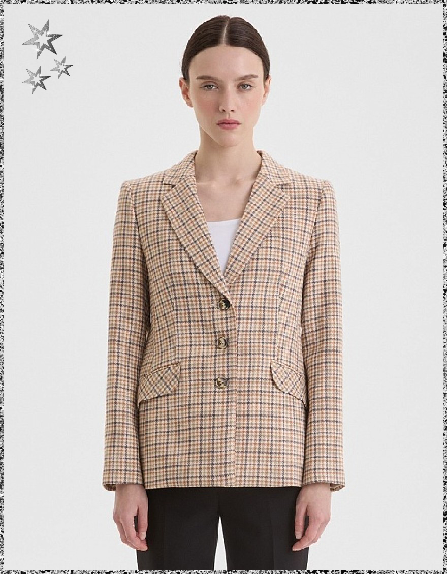Универсальный жакет в клетку в спокойной цветовой гамме из поливискозной ткани, слегка удлиненный, приталенный, однобортный, английский воротник, прорезные карманы с клапаном, прямой борт, застежка на пуговицы, длинный втачной рукав, тонкие подплечники, модель на подкладке. Поливискозная ткань - смесовая ткань, в состав которой входят волокна вискозы и полиэстера. Именно полиэстер придает ткани прочность, долговечность и опрятный внешний вид.